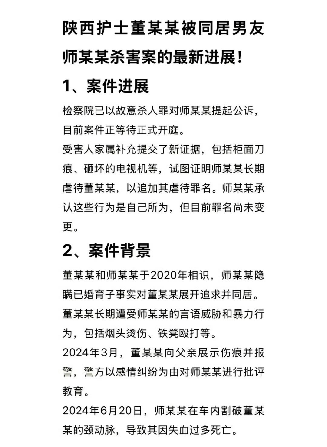 西安一个31岁的女护士,被同居了五年的男友割喉杀害,整个过程听起来就像电影里的恐怖片,可它真真切切地发生在现实里。两人本来是通过亲戚介绍认识的,一开始女孩还以为找到了靠谱的对象,没想到这个男人早就隐瞒了自己已婚还育有两个孩子的事实,打着“单身优质男”的旗号追她。从2020年开始交往后,她的日子就慢慢变成了噩梦。 刚开始只是吵架,后来发展成动手打人。掐脖子、拿烟头烫、用铁凳砸,各种暴力手段全上了。她爸爸有次去她家,看到柜子上有刀砍的痕迹,电视被砸碎,连椅子钢管都弯了,当场就换了门锁,逼女儿分手。可没过多久,那个男人又找上门来,当着她爸的面还嚣张地说“我打过她很多次”。更离谱的是,女孩报过警,可警方觉得这是“感情纠纷”,只批评教育了一下,根本没起到震慑作用。她也曾在凌晨哭着给家人打电话求助,可每次都被威胁、恐吓,最后只能撤案。 其实她一直在挣扎。日记里写满了绝望,“这个月就像地狱一样,已经记不清第几次被勒脖子了”“他像寄生虫一样,吸走我的钱,也吸走我的命”。她顶着脖子上的伤去上班,眼睛红肿也不敢请假,生怕惹对方发火。她知道自己陷得太深,但也一次次想逃。直到那天晚上,她终于鼓起勇气在车上提出分手,没想到换来的是致命一刀。那个男人早就准备好了四十公分长的双刃刀,就藏在驾驶座脚垫下,一听她要分手,直接动手割她脖子。 最让人发指的是,杀人之后他没有立刻救人,反而把副驾驶的靠背放倒,从后备箱拿出提前准备好的棉被,盖在还在流血的女孩身上。她眼睛睁着,血一点点流干,而他冷静地用手把她的眼睛合上,然后若无其事地开车转悠了一个多小时,期间还打电话聊天,最后才慢悠悠地去派出所自首。法医鉴定说她是右侧椎动脉破裂大出血死亡,那一小时的拖延,彻底断送了任何抢救的可能。 庭审的时候,家属放弃赔偿,只求判他死刑。他们说,这不是简单的冲动杀人,而是蓄谋已久的恶行。车上带刀、带被子,连作案工具都是管制刀具,明显是早有准备。可凶手还在狡辩,说自己只是“上头了”,平时拿刀削手皮玩。这种话谁信?一个长期施暴、控制欲极强的人,早就把对方当成自己的所有物,一旦失去控制,就会用最极端的方式毁灭。女孩生前最后一篇日记写着:“请你务必一而再,再而三,毫不犹豫地救自己于人间水火……你才是最重要的。”她明明那么努力想活下来,可最终还是没能逃出那个魔掌。这不只是一个人的悲剧,更是对整个社会的警醒——当家暴被当成“家务事”轻描淡写地处理,下一个受害的,可能就是任何人。护士遇害 女护士被杀案