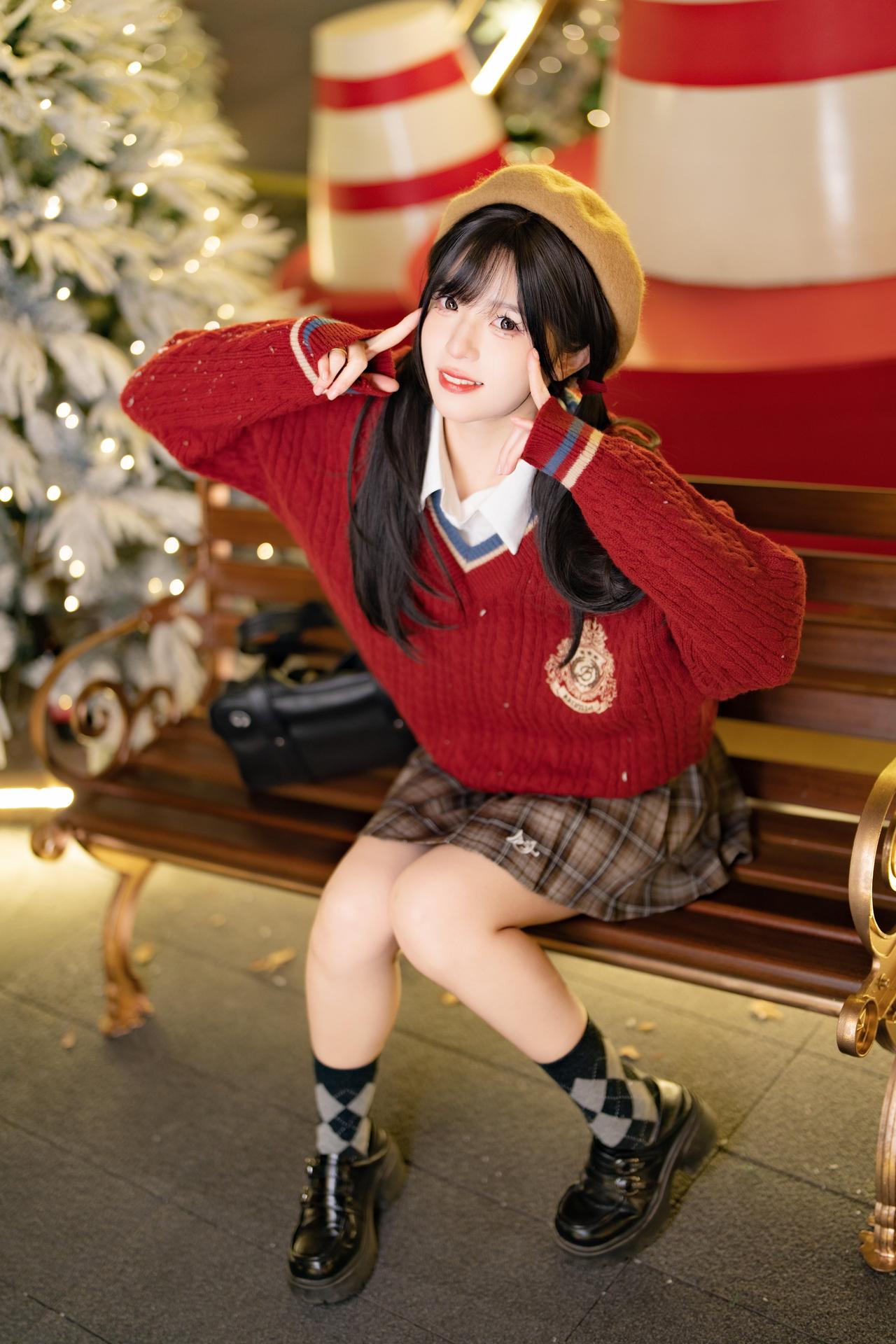 冬日暖阳下的少女,红毛衣与圣诞树相映成趣,甜美可爱。