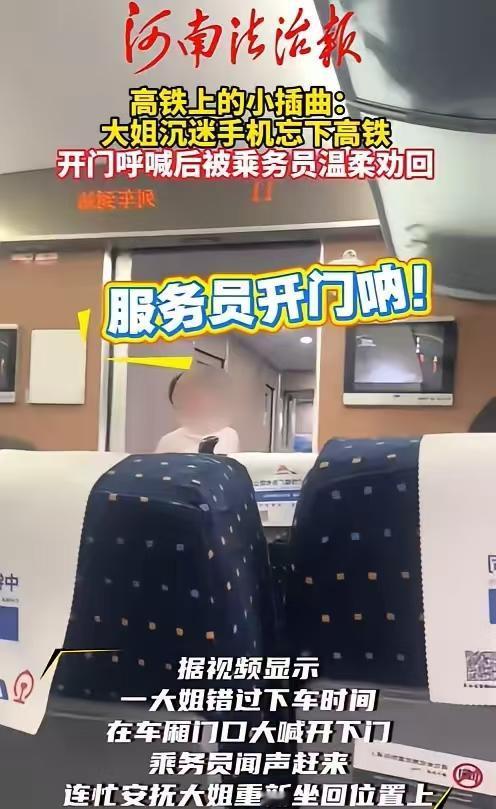 真的是无语了,安徽一女子坐高铁因低着头不停的玩手机,错过了自己下车的站! 女子发现自己坐过站了,就突然大喊大叫起来,叫来服务员开车门,再不开车门就来不及了,双手还拼命的拍打着车门,情绪非常激动,引来了各种异样的目光,惹得车厢里不得安宁! 服务员耐心安慰的说道,已经过了停车的时间,不可以停下来!静侯等待下一站! 其实,车厢里每到一个站点,都会有提示的广播报站,可这女孩还是依然沉浸在手机中! 都是成年人了,不痴傻又不聋哑的,自己造成的过错,应该妥善处理,像这样子大吵大闹,真的是令人不解和气愤! 各位读者你们怎么看?欢迎在评论区讨论。