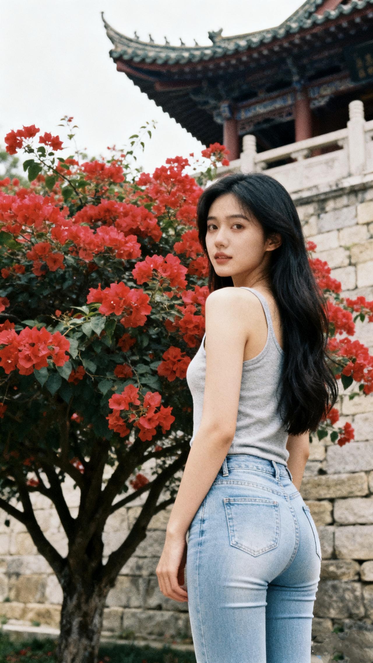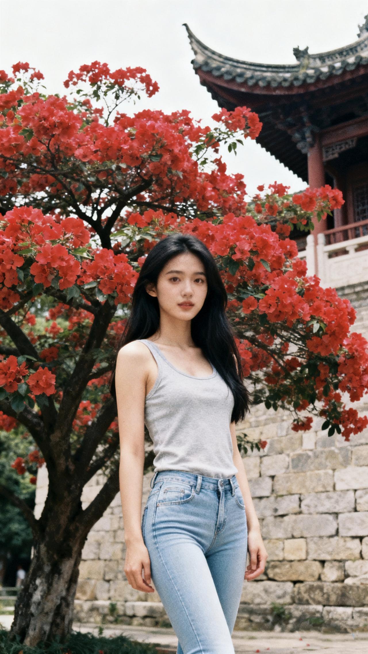 阳光下的温柔女孩,白色蕾丝上衣搭配牛仔裤,清新自然。
