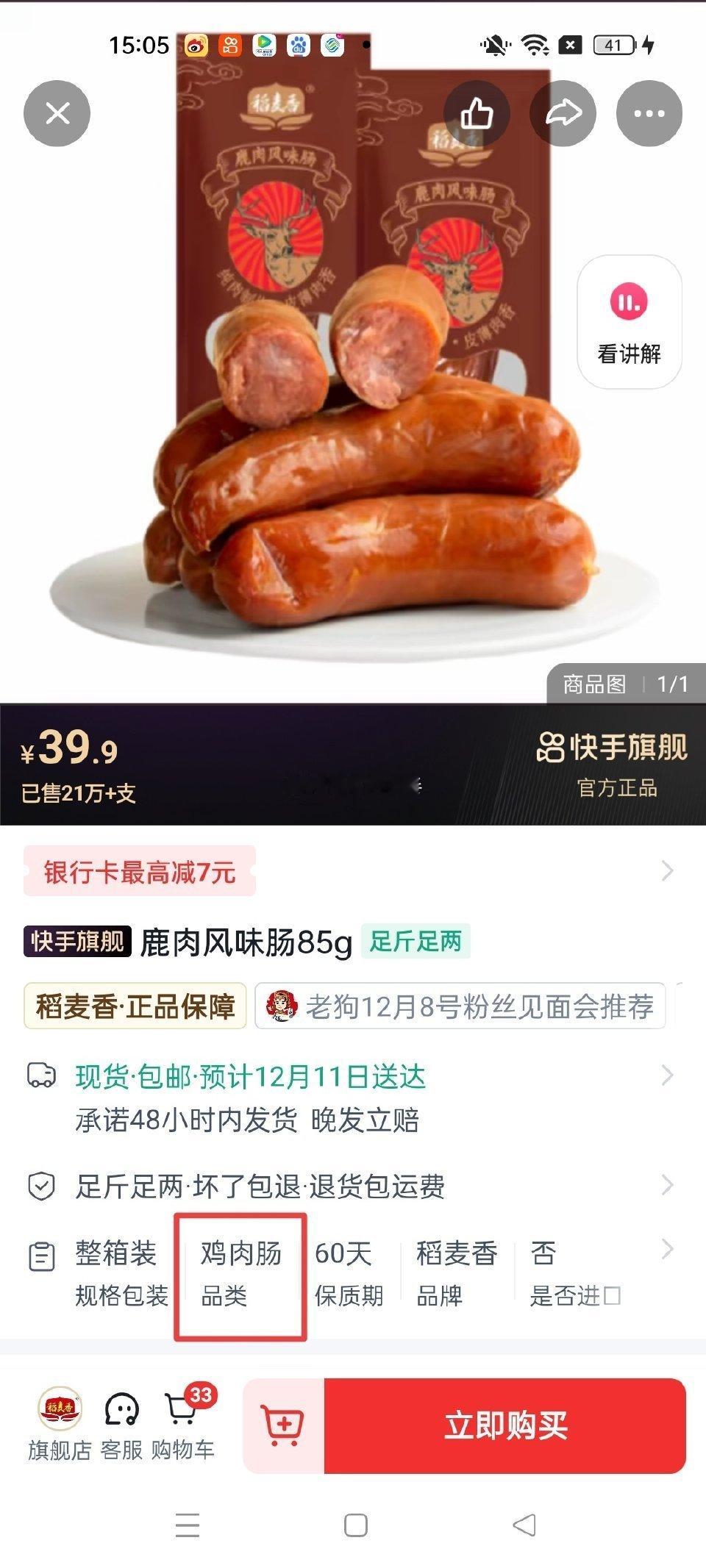 网红鹿肉肠变鸡肉肠快手主播:老狗(128)办活动卖的鹿肉肠【用风味二字规避虚假