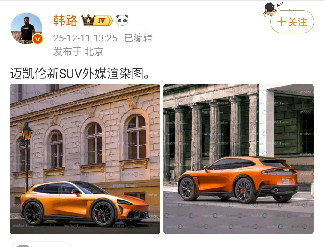 韩路:迈凯伦新SUV外媒渲染图!网友:这不是小米YU7吗? 外媒绘制的这个迈凯伦suv猜想图,长得太像小米SU7了,可能是优秀的设计总是心有灵犀吧。 不过这仅仅是外媒的猜想图,迈凯伦会不会出这款车,还说不一定呢。毕竟这些顶级超豪品牌,每次发布新车之前保密工作都做得特别好,为了车型实现最大的伪装,有时候还会将自己的车型伪装成外观相近的车型。 各位是怎么看的?欢迎评论区留言。