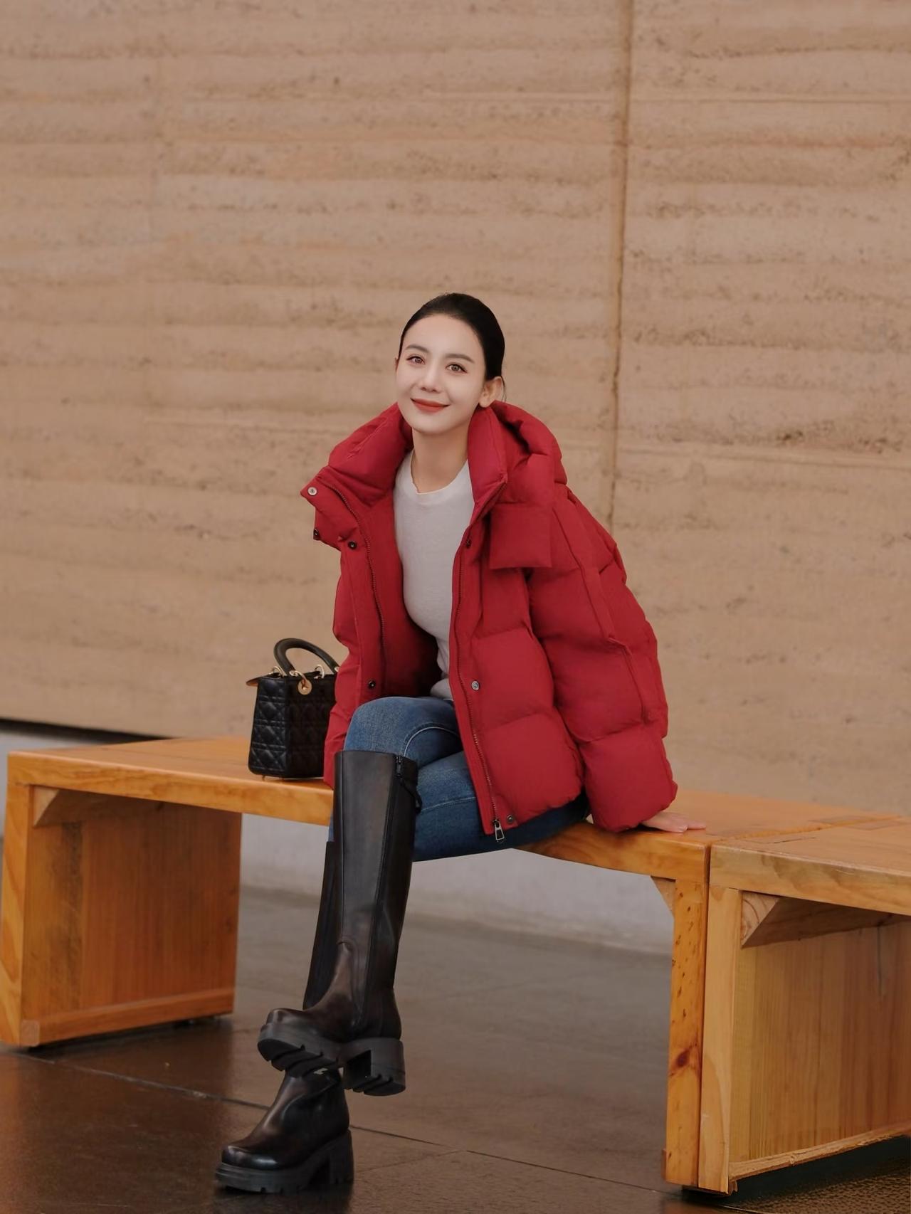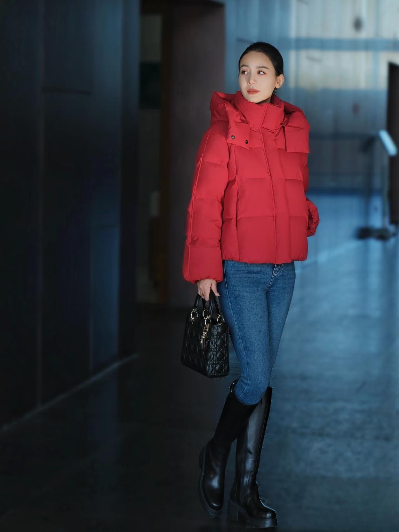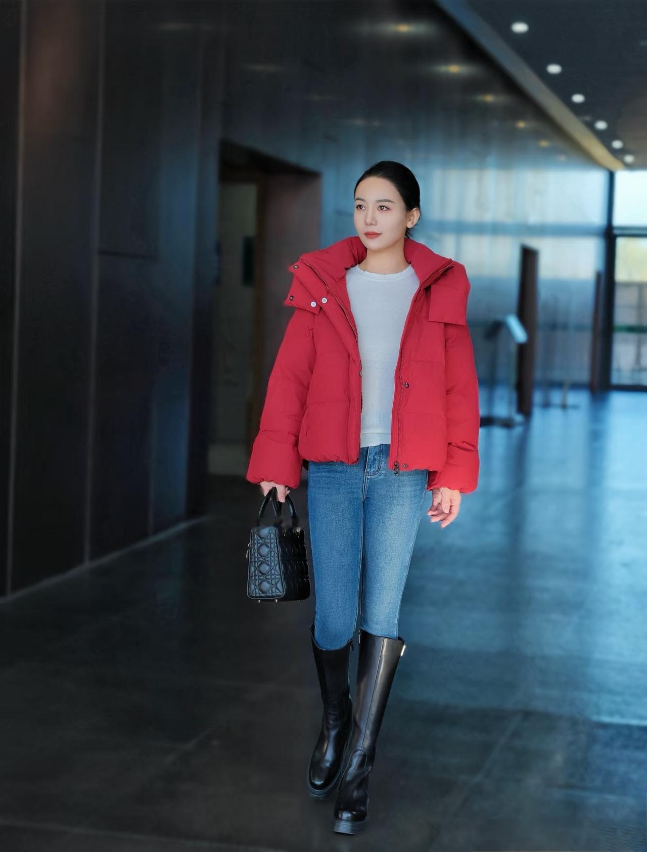 有哪些女生日常好看穿搭可以借鉴红羽绒服搭配牛仔裤和黑色高筒靴,既保暖又时尚好看!