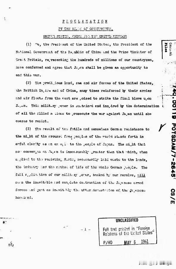 打小都知道《开罗宣言》、《波茨坦公告》,最近因为众所周知的原因,“耳濡”多了,不免想“目染”,找出原文拜读了一下,没想到这么简短:《开罗宣言》2页,《波茨坦公告》3页!?这可是有点草台啊。 转头一想,是自己肤浅了,长也好短也好,都得拿实力出来做最终解释。 波茨坦公告 开罗宣言 如何看待日本对《开罗宣言》的态度