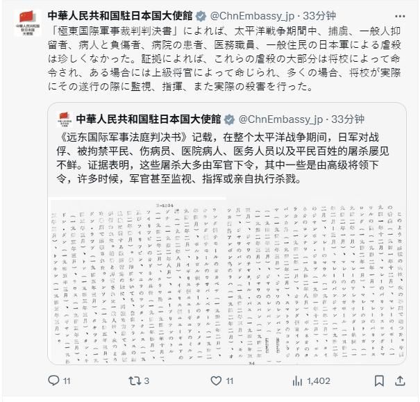 中国驻日大使馆今天发文:美国不要忘了整个太平洋战争期间,日军对战俘、被拘禁平民、