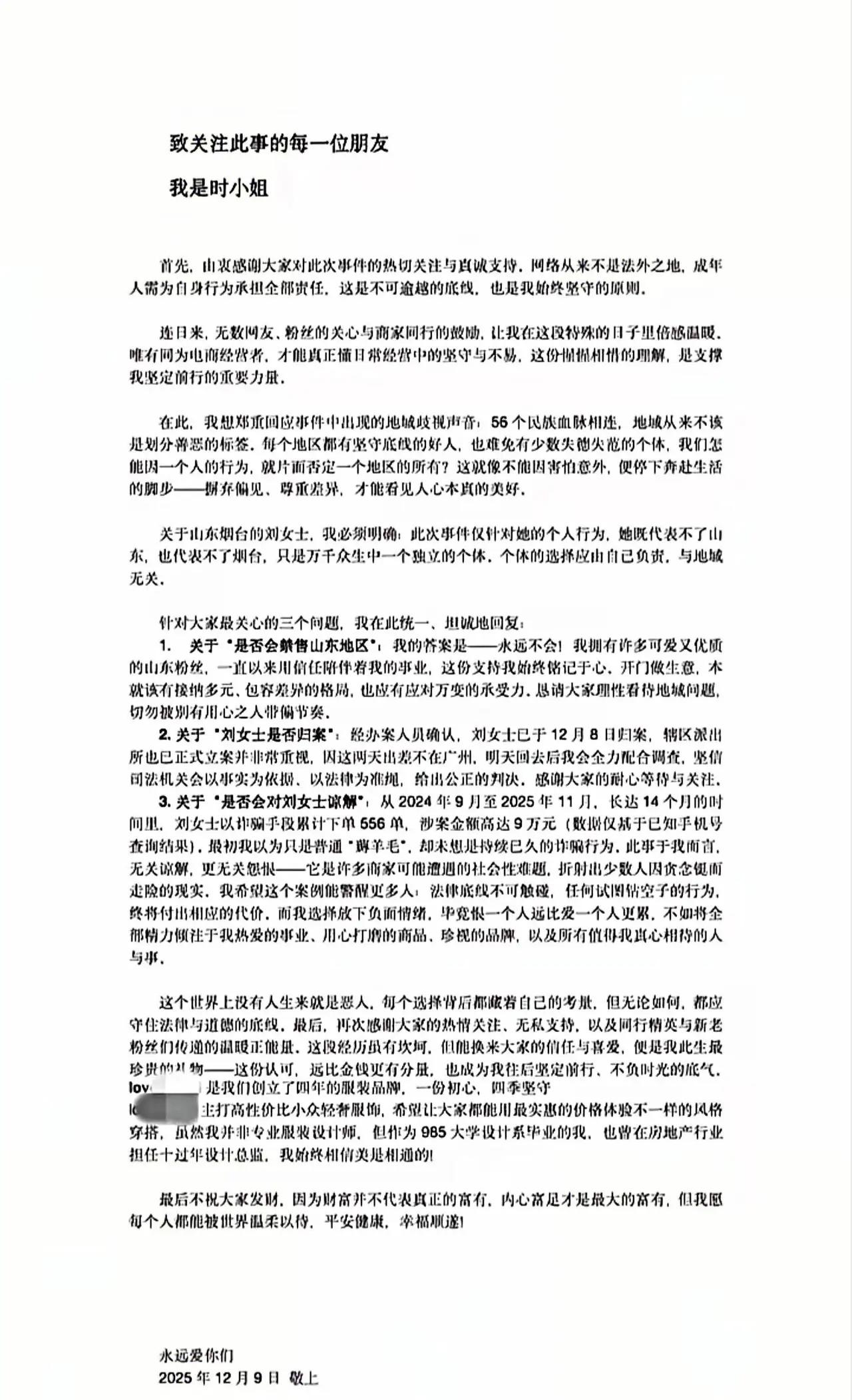 烟台人怒了,一位姓刘的女子,利用平台的漏洞,骗了商家时女士近9万元,以一己之力,坏了烟台的名声,烟台网友表示:严惩! 从快递信息显示,这名刘姓女子邮寄地址是烟台福山的,不知道是不是本地人,脑瓜子够聪明,但是用错了地方,聪明反被聪明误! 一粒老鼠屎坏了一锅粥,这件事情曝光后,评论区不少网友把情绪发泄到山东人身上,说山东的退货率高,不诚信啥的。 一直以来,山东人在全国的口碑都很好,大家认为山东人勤劳善良、厚道仗义,没想到,因为这样的个别人,给山东人抹了黑。 多行不义必自毙,近日,商家时女士透露,姓刘的女子已经归案,这一结局,烟台人也拍手称快。 时女士对这件事情的处理,堪称教科书,发现被骗后,冷静搜集证据,寻求法律援助,分享到平台扩大影响,拒绝私下和解……思路清晰,态度坚决,不愧是985大学毕业的。 更值得称赞的是,时女士对这件事情的态度,客观公正,她说这是刘姓女子个人行为,拒绝地域黑,承诺不会对山东禁售。
