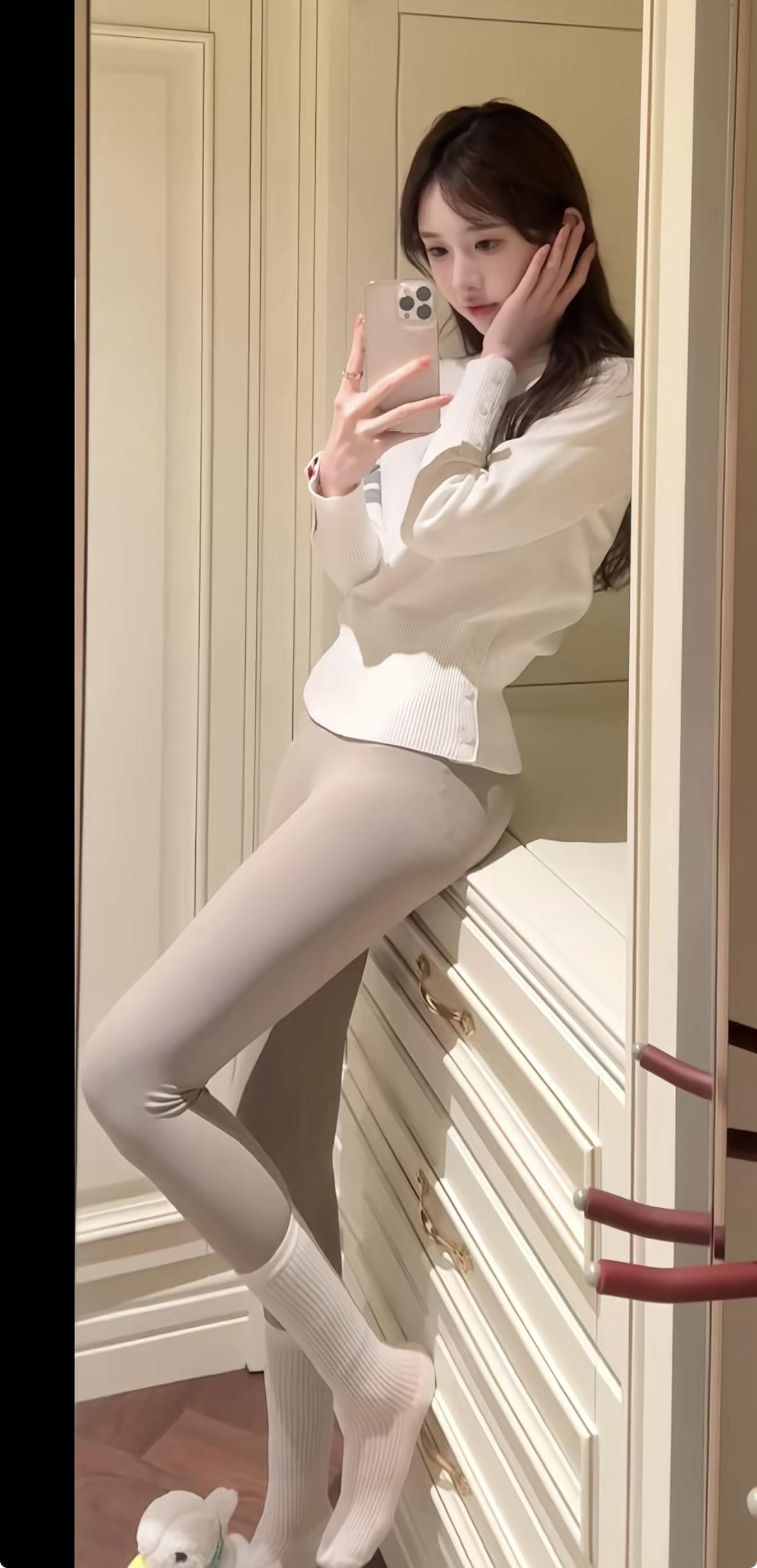 白色毛衣+灰色紧身裤,简约又时尚,镜子前自拍,完美展现穿搭!📸✨