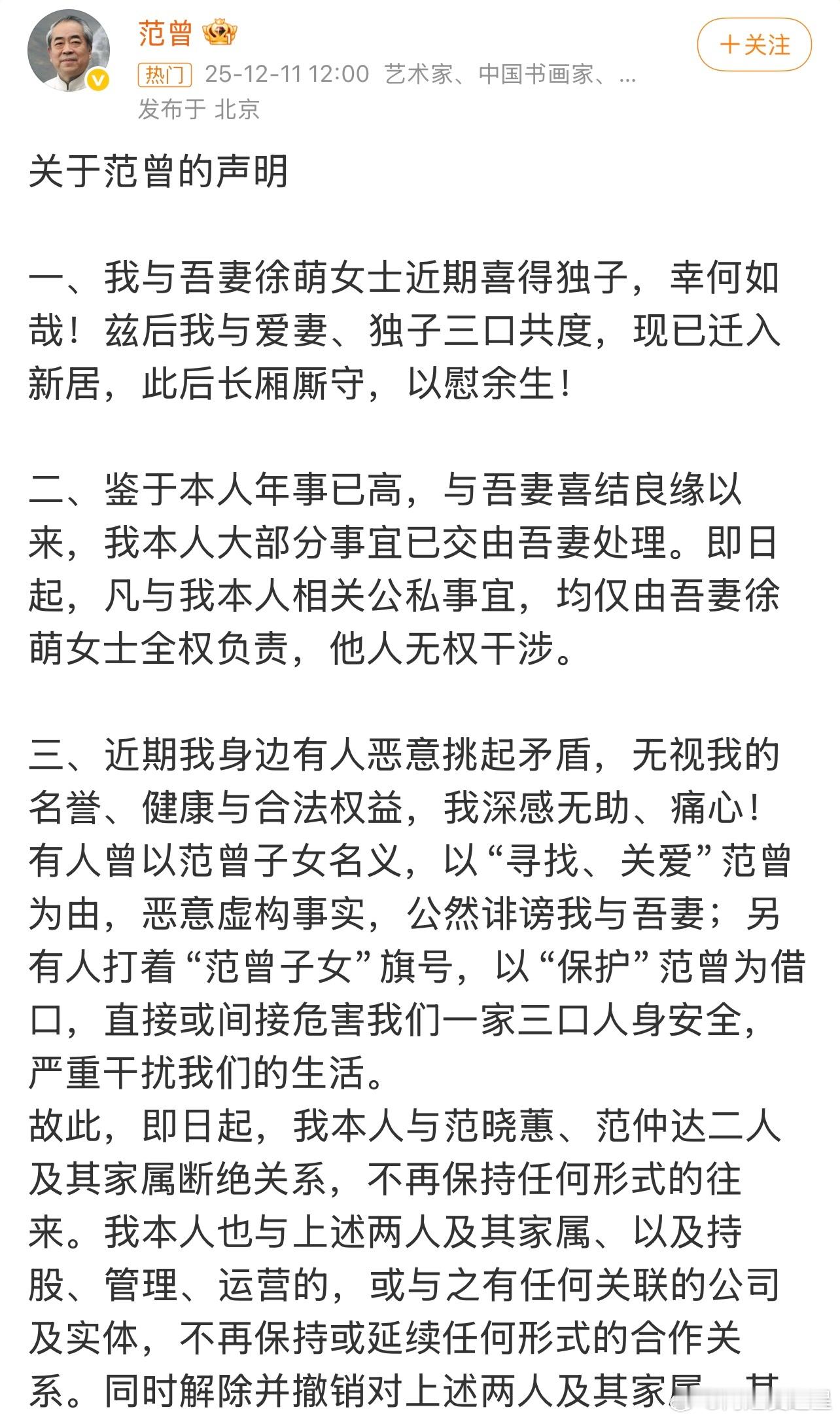 87岁的范曾老来得子的意思吗?跟小娇妻又生了一个儿子的意思吗?然后直接跟亲生女儿和继子断绝了关系,不是还传言娇妻跟继子关系也很好吗他们一家三口要好好过日子范曾宣布与女儿继子断绝关系