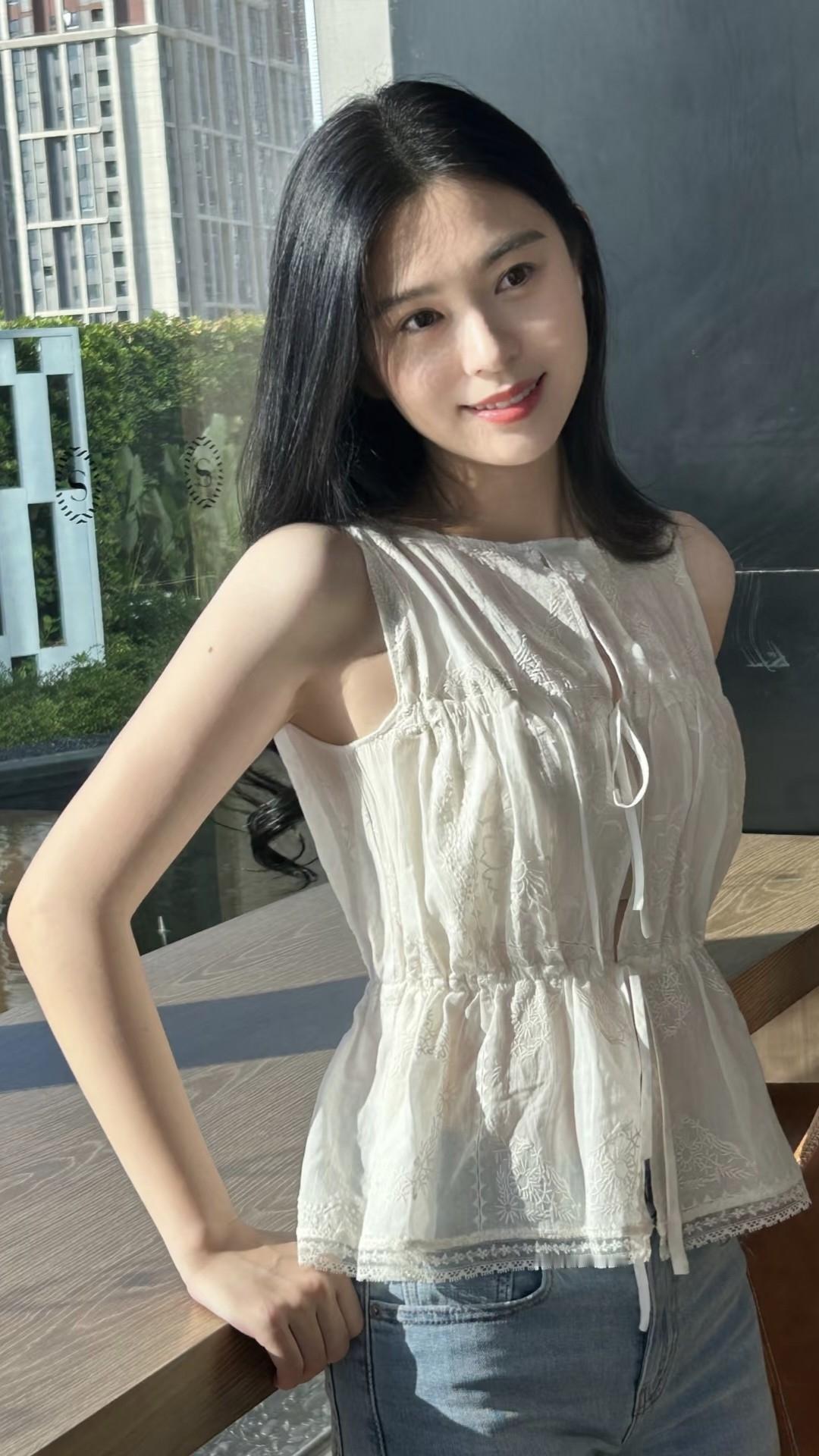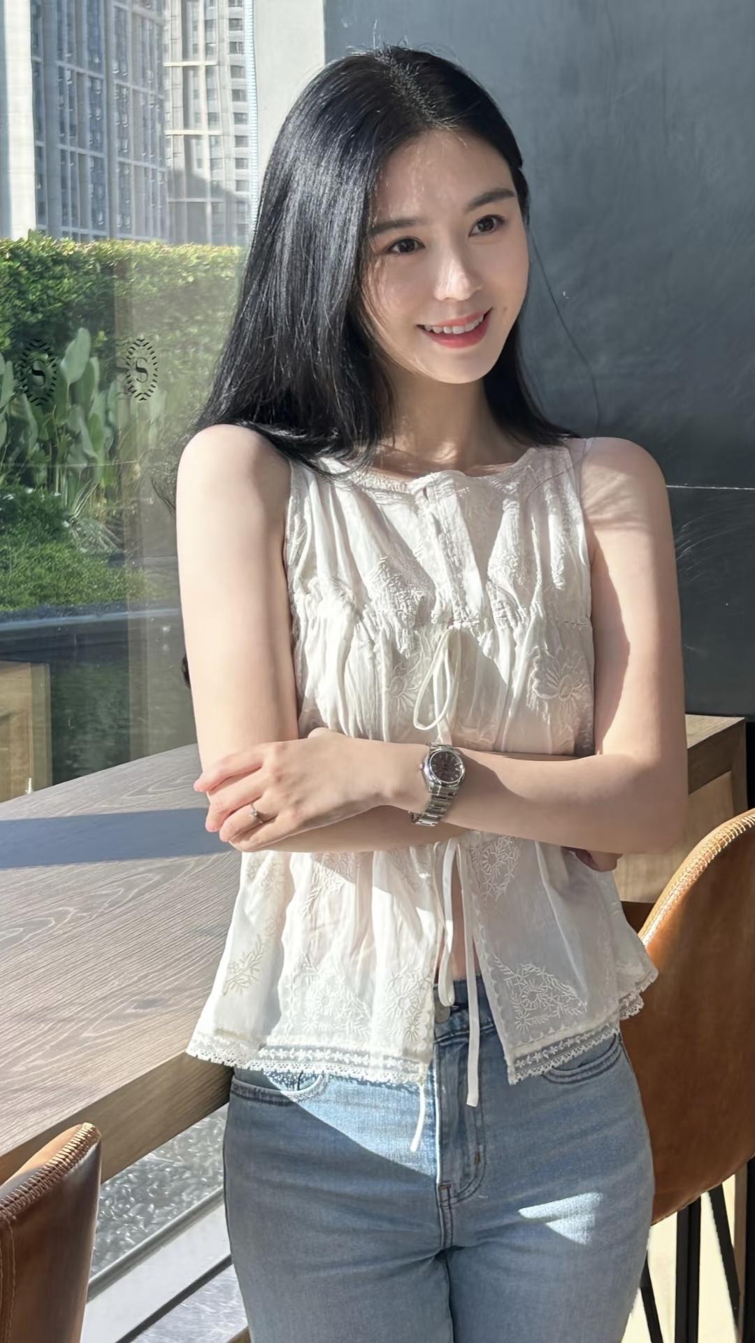 阳光下的温柔女孩,白色蕾丝上衣搭配牛仔裤,清新自然。