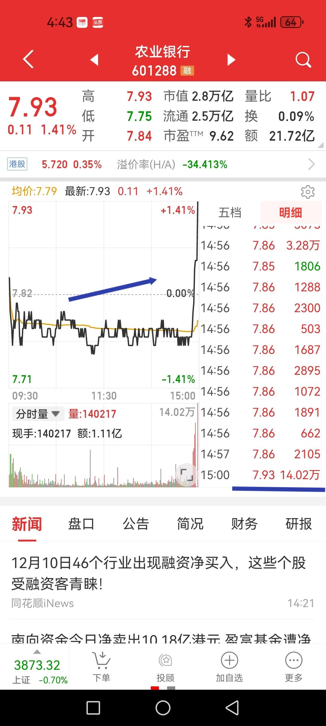 农业银行尾盘爆拉,成分股调整这么厉害啊,早知道该整点哦。 好像中际是调入的,咋个大跌4个点呢?搞不清楚农业银行是调出还是调入,难道有啥关联,懒得去查询,知道的在评论区吱一声。