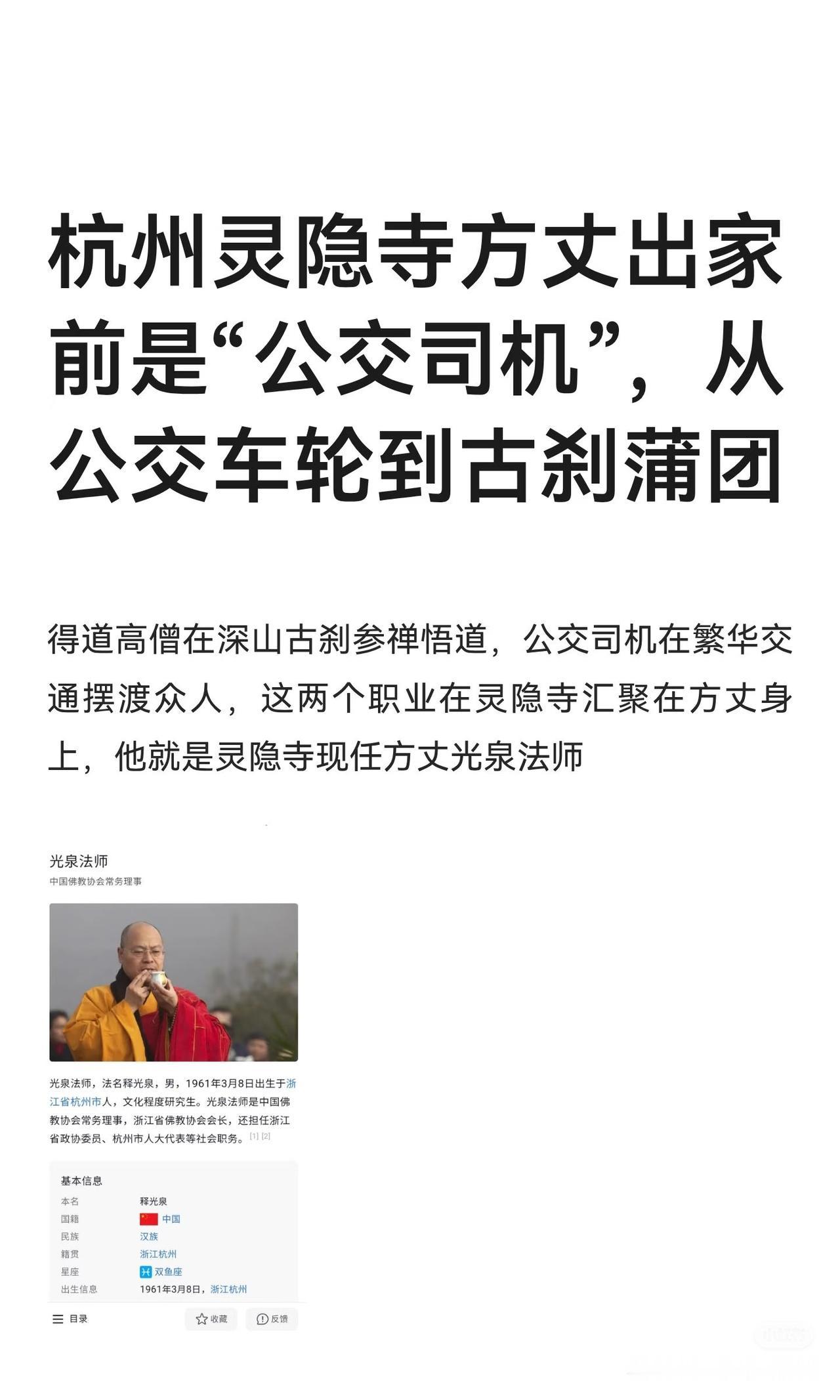 光泉法师的修行,六祖慧能的成就,都有一个共同点,那就是: 生活的沉淀,红尘的历练! 光泉法师18岁开7路公交十年,早晚高峰钻,见惯了乘客为几毛钱吵架,闻过满车厢汗臭,这些烟火气成了后来修佛的根基,父亲去世后出家,搞慈善抓教育,当年的泥土气反而最真。网友说得实在,六祖慧能不识字都能成宗师,关键看生活里的领悟,光泉法师从司机到方丈,就是最好的例子,日子里的每段经历,都是修行的阶梯。 你说这佛法的修行,哪用非得出家才算?在生活里渡人,说不定更能修得本心呢?