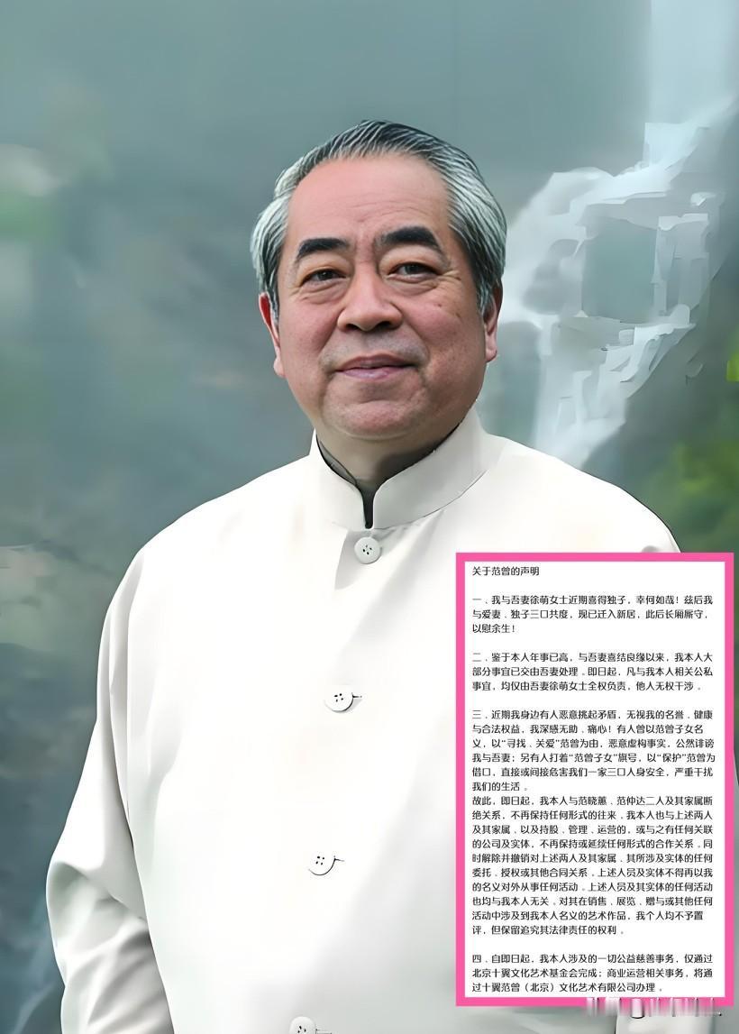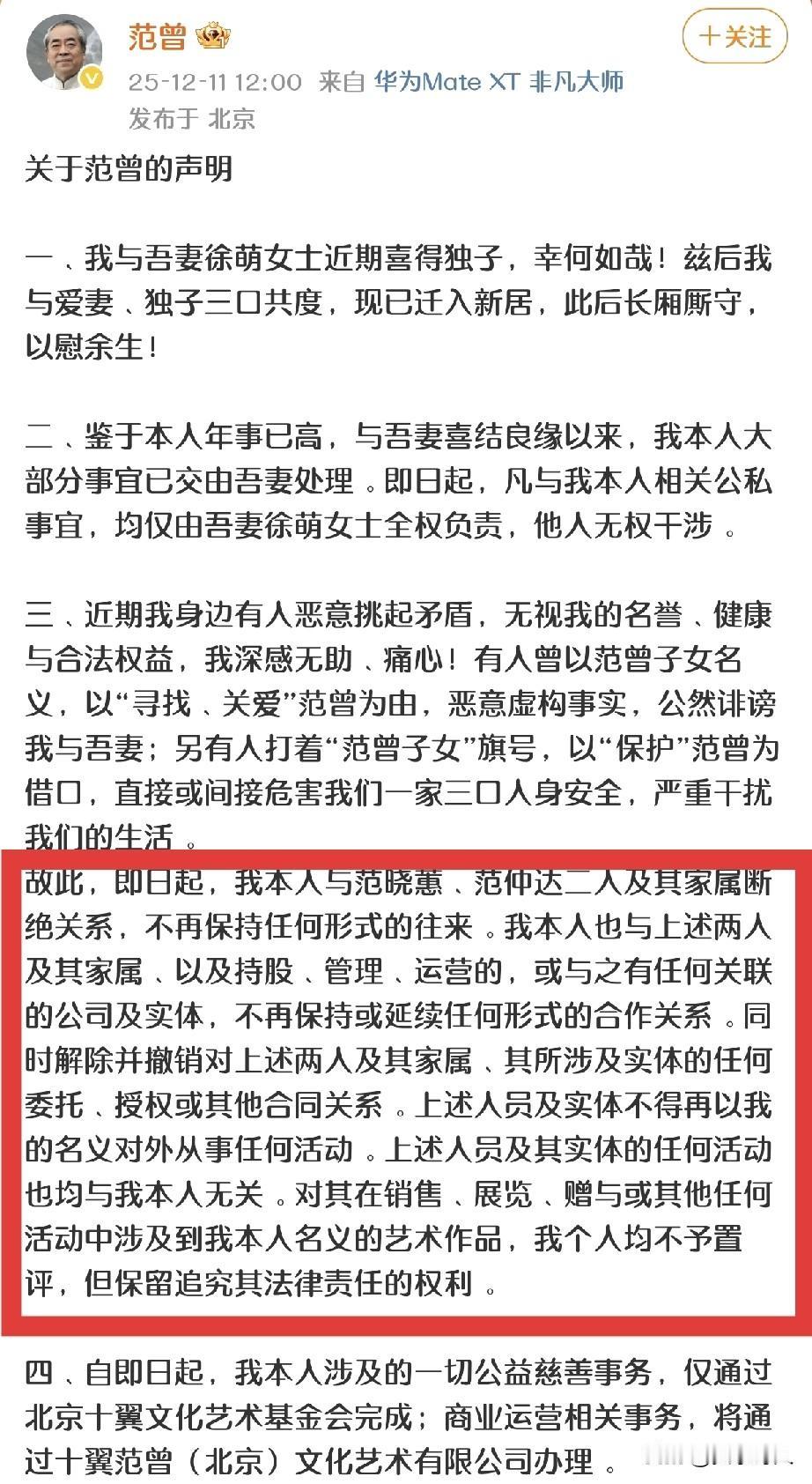 87岁画家范曾,娶37岁娇妻,喜得一子! 罕见一条声明连发两次,声明与子女断绝关系 📝声明中,更是罗列了子女两大“罪状”: 1⃣恶意抹黑诽谤,挑拨矛盾: 以“关爱”的名义,恶意抹黑,虚构事实,公然诽谤其本人和娇妻; 2⃣侵犯名誉、健康和合法权益: 以“保护”为借口,扰乱其夫妻关系,危害人身健康安全; 因以上种种原因,要与子女划清界限,断绝包括经济、生活等关系! 声明中,还在第一条就表明态度:“要与娇妻徐萌长厢厮守,以慰余生!” [吃瓜群众]看到范大艺术家的声明,吃瓜网友在评论区炸了锅: →“清官难断家务事,艺术家家里也有本难念的经;” →“不怕流氓,就怕流氓有...” →“自古才子多风流,英雄难过美人关!” →“抛开世俗眼光,范先生勇敢追求幸福👍” →“若为娇妻故,子女皆可...😂” …… 范大画家的这操作,你怎么看👀? (取材:微博)