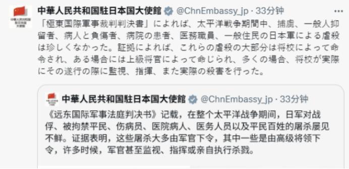 12月11日,在中国驻日大使馆发表:“《远东国际军事法庭判决书》记载,在整个太平洋战争期间,日军对战俘、被拘禁平民、伤病员、医院病人、医务人员以及平民百姓的屠杀屡见不鲜。” 说白了,这篇发文可不简单,暗藏深意,并不只是在还原历史,而是在提醒世界各国尤其是美国,盲目地帮助日本恢复“正常国”的做法,无异于在给自己身后安插一把反噬之刀。 要知道,美国在日本释放的两朵蘑菇云,至今仍让日本民众承受着健康与环境的双重创伤,而日本至今还未对美国展开报复,并且日本恢复“正常国”后,以日本现代的工业技术,估计要不了多久就可以达到和美国持平的状态。 届时,一个既没有彻底反思战争罪行,又具备强大实力的日本,若想践行其暗藏的野心,国际社会再想约束,难度恐怕会成倍增加。 说到底,中国驻日大使馆的发文,其实是想用历史铁证戳破美国“养虎为患”的风险,如果美国坚持要为了短期的地缘私利,继续纵容甚至是助推日本成为“正常国”,终将亲手引爆亚太安全的的“定时炸弹”。