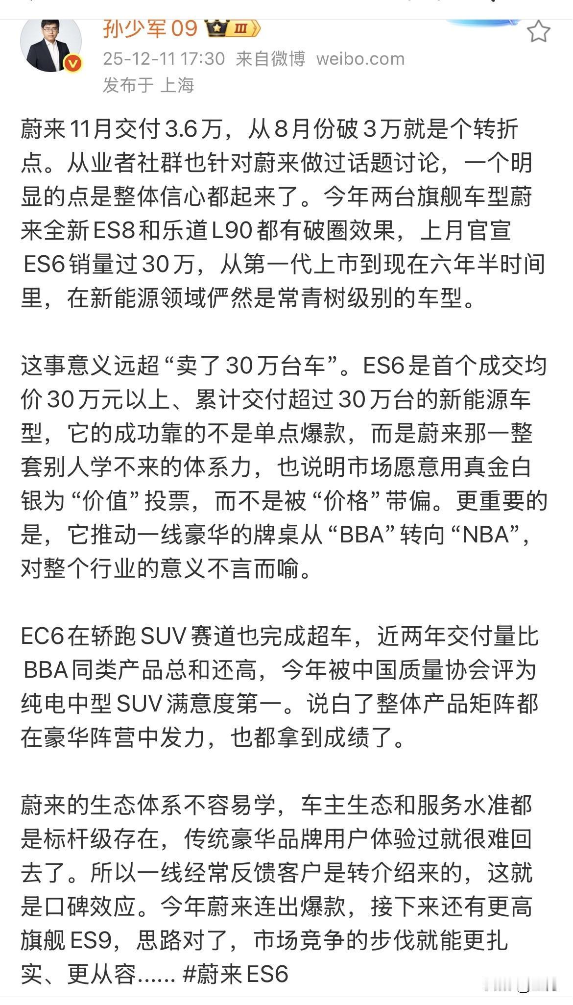 孙少军:蔚来已经连续一个季度,交付超过3万台! 就在刚才,孙少军来上一个季度