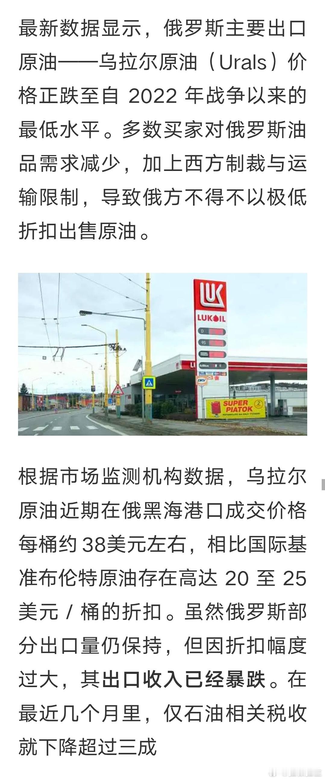 俄乌冲突俄罗斯亏本卖油:乌拉尔原油跌到战争以来最低价38美元每桶