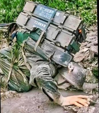 即使是摆拍, 也认可照片的价值, 它是一次真实重现。 很多人的付出比这位小战士还要多,牺牲的瞬间是没有机会,更没有办法摆拍的。 身背3箱, 72式反步兵地雷, 重量达80多斤, 脸上是泥浆, 伪装色! 这个姿势,一看就是在喝泥水,不是被打死了。判断很简单,看他大小臂的支撑动作就知道。 如果牺牲了,是没有这个支撑动作的。 认真讲,这样的照片很震撼人心。但是 军队严格禁止这样喝水,红军过草地就有类似的禁令。 照片出自对越自卫反击战,具体日期和地址未知,没有人知道这名英雄士兵的名字。 但愿, 他还活着!