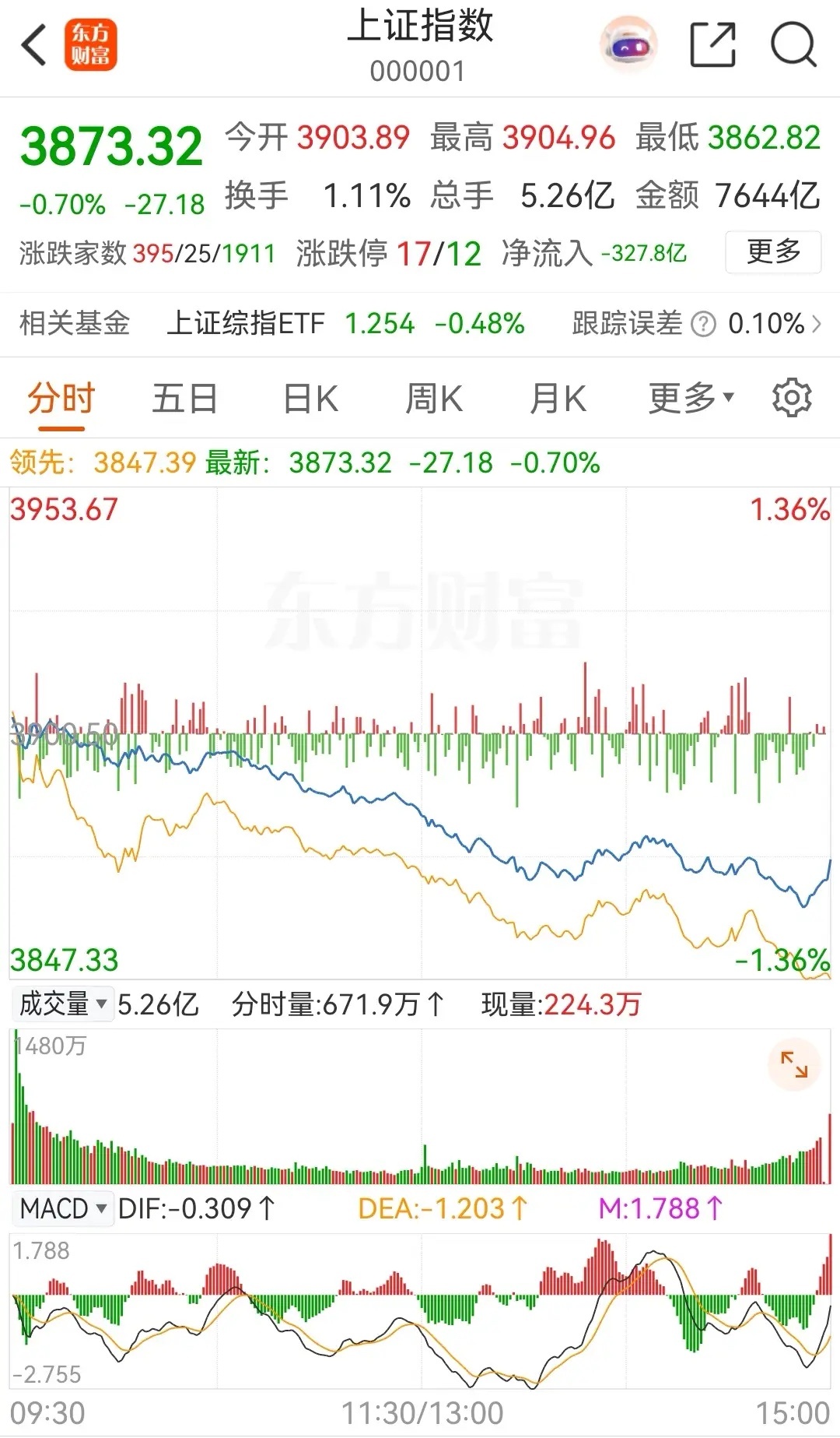 大盘今天高开低走,一路下挫,只是临近尾盘时稍有勾起,黑色星期四果然是名不虚传!今天的市场走势太弱了,早盘借利好小幅高开于3903,震荡整理后开始阴跌,今天的最低点是3862点,最终收报于3873点。今天两市个股下跌家数高达4378只,两市的成交额为1.8571万亿元,较昨日放量 786 亿元。从盘面上看,行业板块呈现普跌态势,仅有风电设备、非金属材料板块逆市上涨,房地产、商业百货、船舶制造、互联网服务和教育板块领跌。对于大盘明天的走势,暂看将会收出一根带上下影线的休整十字星。具体走势过程是,明天上午大盘将先小反抽,之后再回踩,然后横盘;下午将会有资金进场做多护盘,尾盘时再小幅勾起。当然了,这只是根据今天的收盘情况,暂时做出的推测而已,仅供参考。