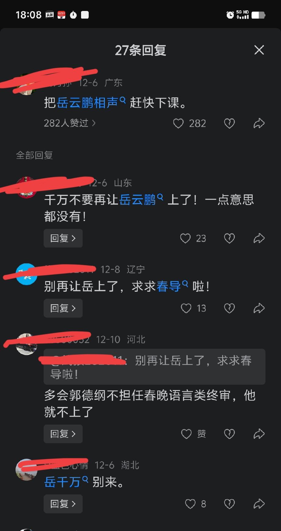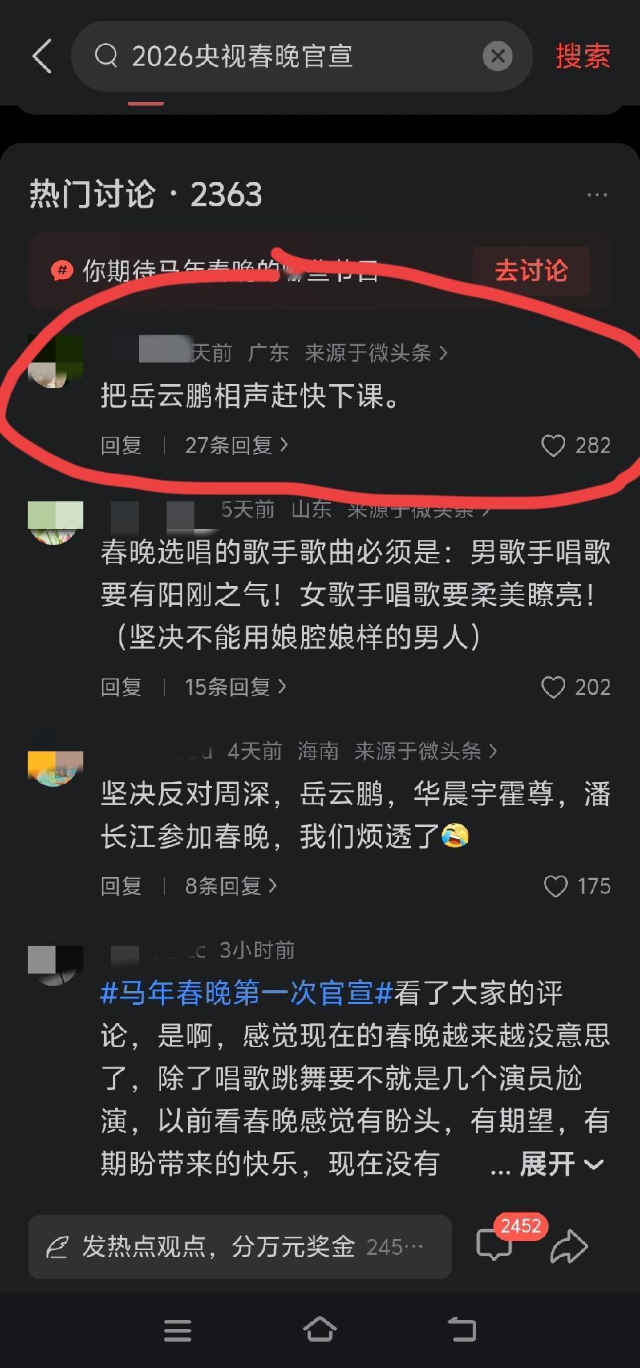 2026年的春晚官宣亮相了! 评论区里呼声最高的居然是: 求岳云鹏别来了[捂脸]。 下图来自今日头条用户客观点赞数据排名。最多点赞的,就是不希望岳云鹏再说相声了。 其实大家都应该还记得,早在2025年春晚直播现场,就有观众当着全国人民的面,希望岳别来春晚。 我觉得岳缺乏一些文学素养,他的段子不够优美,也没有类似于《我不是药神》,《第二十条》那种具有推动社会进步的现实意义作品。 当然啦,岳云鹏还是属于年轻人励志逆袭的典范,值得学习表扬[赞]。 春晚建议 春晚民调 你期待马年春晚的哪些节目 2026年