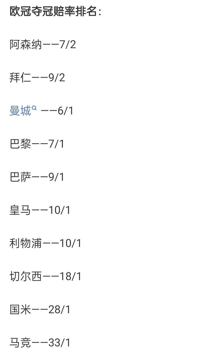 欧冠最新夺冠赔率榜:阿森纳居首,拜仁、曼城、巴黎、巴萨前五,皇马第六,利物浦第七 12月11日 欧冠联赛第6轮结束,相关机构列出了夺冠前十的赔率榜单:阿森纳居首,拜仁、曼城、巴黎、巴萨排二到五,皇马、利物浦、切尔西、国米、马竞排五到十