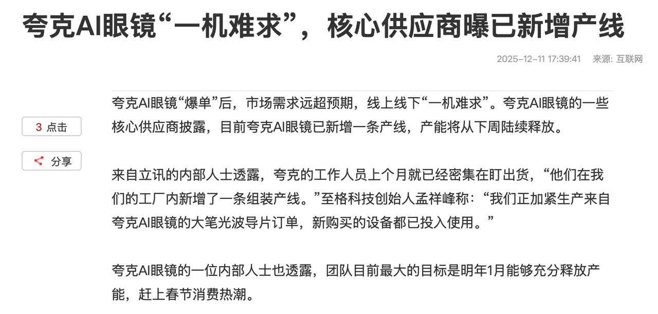 过去一年,阿里的千问大模型一路硬刚国际对手,从学术成绩到行业落地持续冲榜。但真正让普通消费者第一次“摸到中国AI的实力”,就是夸克AI眼镜。 这也解释了为什么这些天,夸克AI眼镜会出现连夜排队、全渠道售罄的抢购盛况,现货在二手平台被炒到了五千仍然不缺人买,甚至还有人愿意出价按天来租一副,争抢着要体验到这副眼镜。 市场如此火爆,核心供应链也立刻跟上,爆料正在加紧生产,还新增了产线,下周起释放产能。 夸克AI眼镜为什么能火?一句话,阿里把技术做到了用户真正需要的地方。这次不是 PPT,不是 Demo,而是能戴在你脸上的“AI助理实体化”。 就拿无延迟的实时翻译来说,就连前瑞典首相在体验之后都赞同不用再请专人翻译了,而且还能悬浮导航街巷、语音记录会议,让科幻场景照进现实。硬件体验上更是创新拉满,双芯片双系统突破行业瓶颈,7.5mm超窄镜腿、4000nits双光机显示、可换电设计重塑佩戴体验,“一句话”就能给你办成事。 这是背后的硬实力,也是“中国制造”带来的撑腰底气。 行业巨头们负责创新,中国供应链负责把创新变成老百姓能买到的产品。这场景,像极了中国近十年的科技崛起,我们不仅能做出领先的模型,还能做出体验领先的产品,还拥有全球唯一能大规模快速量产高科技产品的体系。 夸克AI眼镜卖爆,也是中国AI产业链的一场集体胜利。