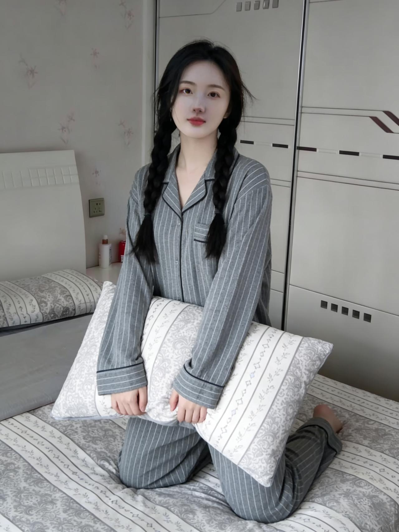 灰裙抱枕跪床前,双辫垂腰意惘然。 静对寒窗思往事,一痕月影落枕边。