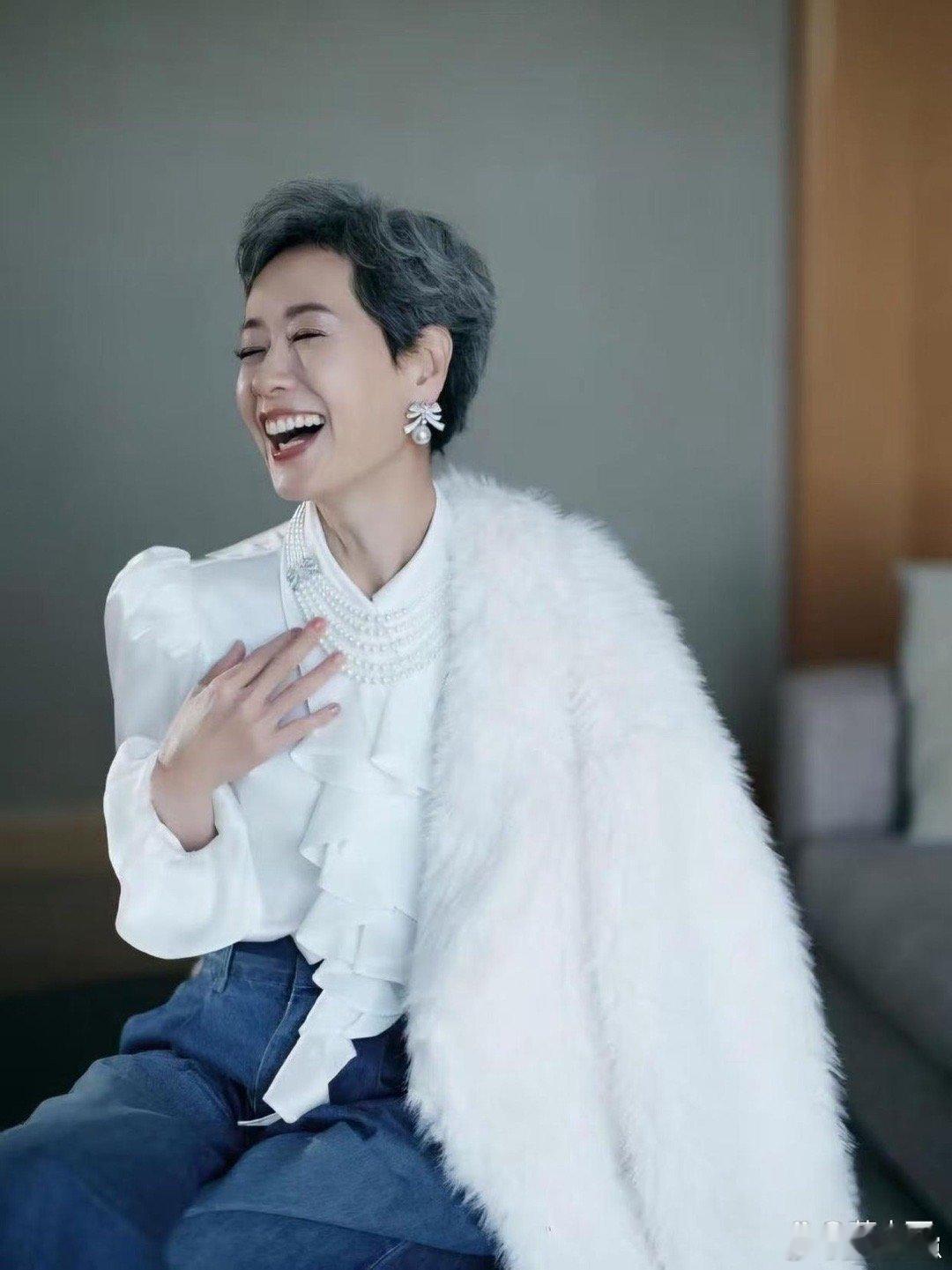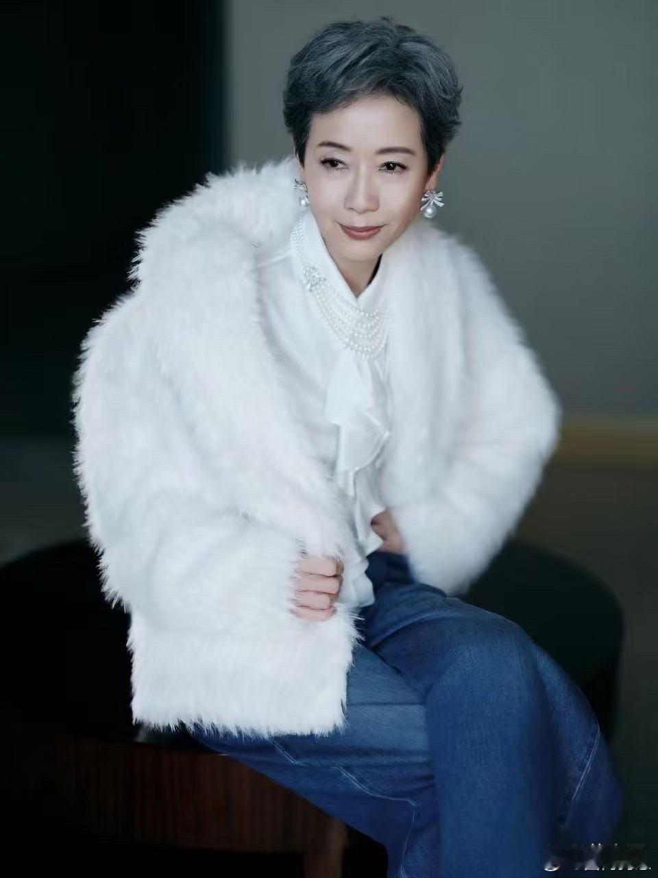 叶童的老年穿搭太圈粉!白色毛绒外套搭配衬衫与牛仔裤,简约造型自带贵气感,优雅惊艳超吸睛~