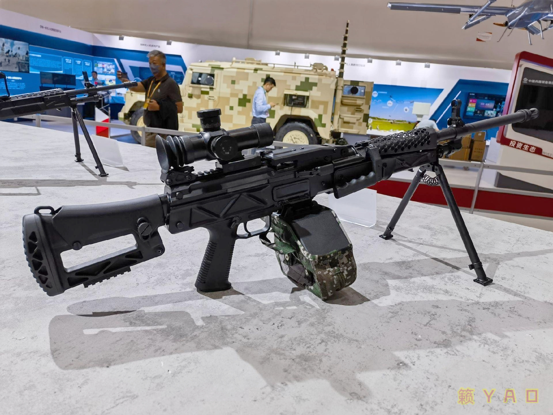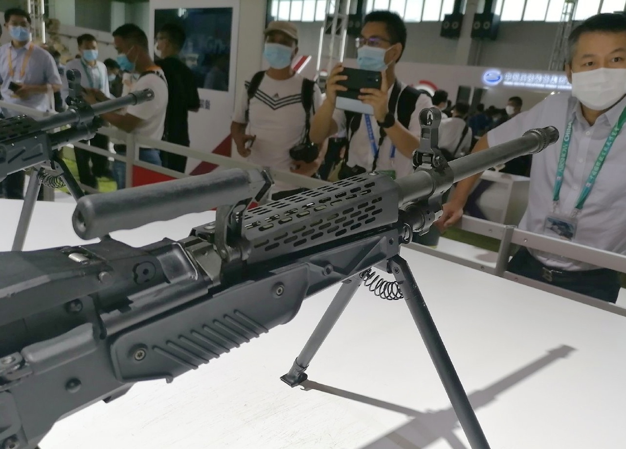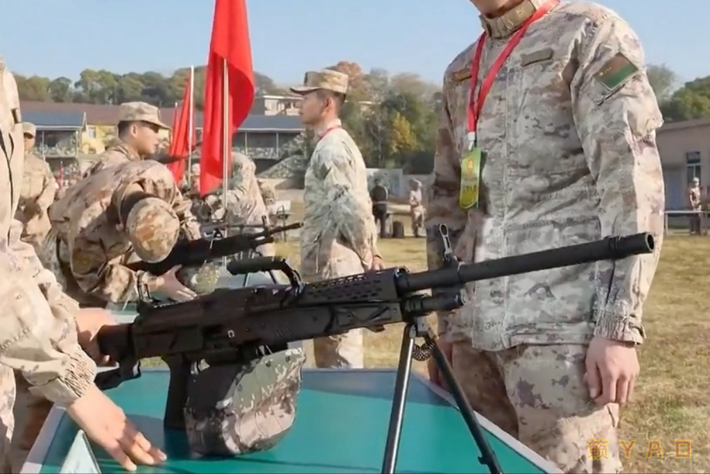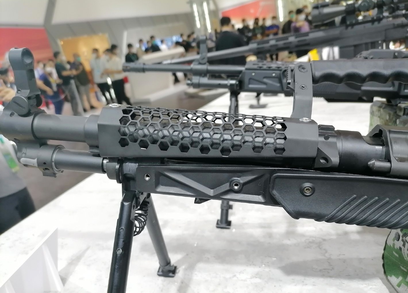 陆军步兵学院第五届“精英”射击邀请赛活动上展出的201通机(p1、p2)和西部试装的版本上护手/隔热罩形制不一样,这种条形孔的版本在21年第13届珠海航展时首见,而蜂窝孔的版本在19年阅兵后即下BD试用,近几年的各种展览上2种形制上护手/隔热罩的版本皆有出现,看厂家心情,拿到哪挺就哪挺。