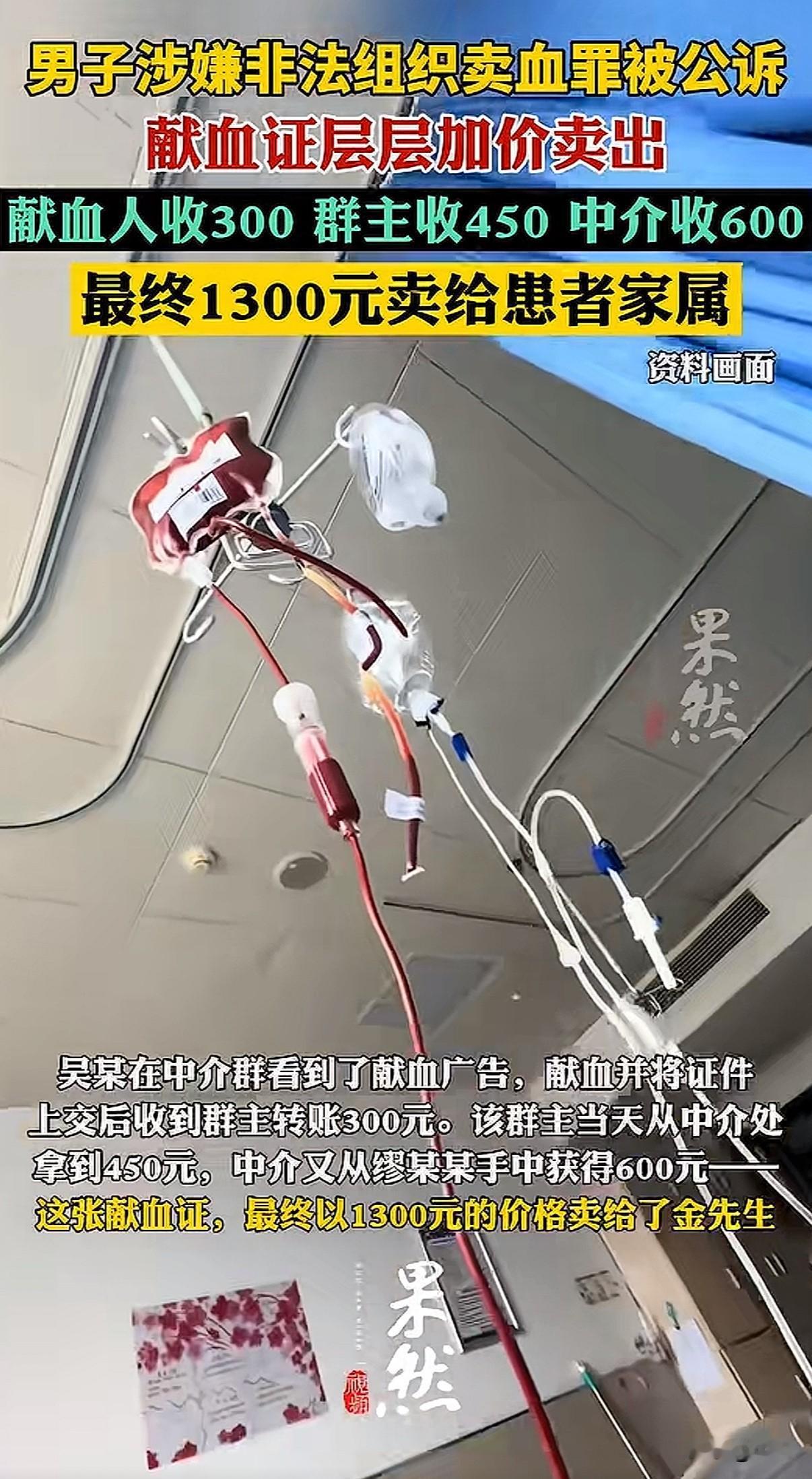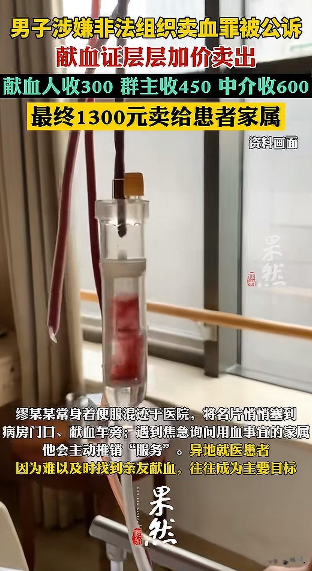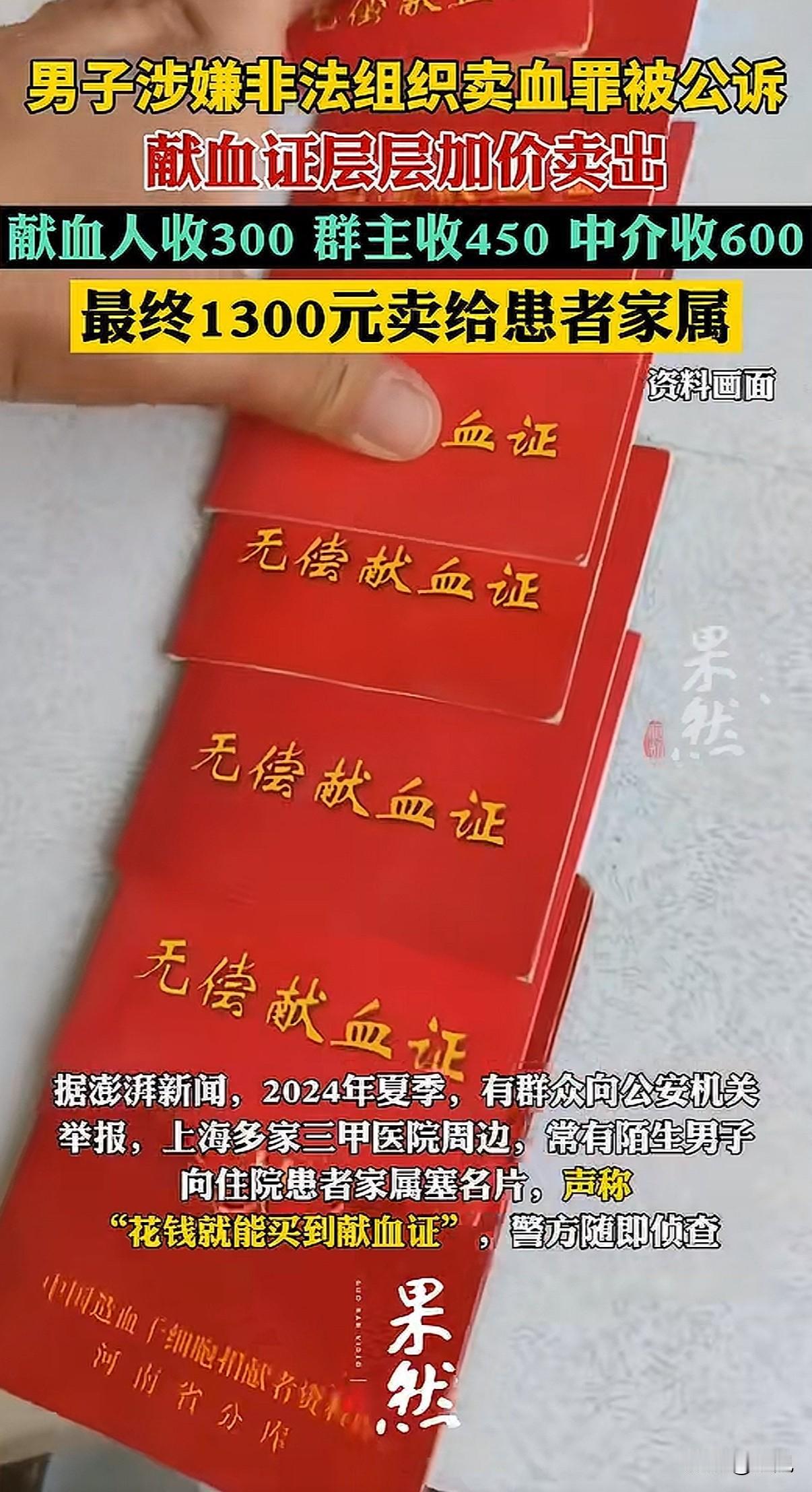 300元收的献血证,转手卖到1300元! 上海闵行区检察院最近起诉了一个姓缪的人。他干的事,就是在医院里倒卖献血证。 怎么操作的呢?他先找人去献血。从昆山、苏州这些地方招人,给这些人300到650块钱,让他们在上海的血站献血,拿到那张“互助献血证”。 证到手了,他就开始找买家。买家主要是谁呢?是那些从外地来上海看病的患者家属。很多大手术需要备血,医院会建议家属“互助献血”。可人生地不熟,亲戚朋友一时赶不过来,家属一着急,就找到了像缪某某这样的人。 一张成本300多的证,他卖给家属要1300元。这中间的钱,可不是他一个人全赚了。下面还有“群主”、“中介”。比如有一次,献血人吴某拿到300元;拉他来的群主从中介那儿拿450元,赚了150差价;中介再从缪某某那里拿600元,又赚150;最后家属付了1300元,缪某某自己落下700元。三张证打包卖,家属就得掏3900元。 缪某某经常在上海几家大医院转悠,发名片,上面写着“快速解决用血”。他联系人时自称“康先生”。有些家属急着用血,只能和他联系。 检察院查明了,他组织卖血超过3个人,非法获利也超过了2000元,这就构成了“非法组织卖血罪”。现在被提起公诉,可能面临五年以下的有期徒刑。 这件事背后,其实是一个两难的处境。一边是“互助献血”的政策,本意是鼓励献血,补充血源。另一边是异地看病的现实困难,家属一时半会儿找不到足够的亲友献血。这个空子,就被钻了。 有家属曾无奈地说:“我们也知道可能不对,但手术等着用血,能怎么办?” 血站是按正规流程采血,献血者也是真献血,那张证也是真的。问题出在最后这个“证”被标上价格,成了商品。它原本代表无偿奉献的爱心,在交易里变了味。 法律已经介入,人也被起诉了。但这个事留下的问号,可能比句号多。它像一面镜子,照出了政策在具体执行时遇到的现实褶皱。怎么在保障医疗用血的同时,又不给患者家属增加不合理的负担,更不让爱心被人套现,这里面的平衡,需要更细致的考量。 到底是谁在为此买单?是那些躺在病床上等血用的病人,是焦急万分的家属,或许,也是我们每个人对医疗体系本该有的那份信任。 献血乱象
