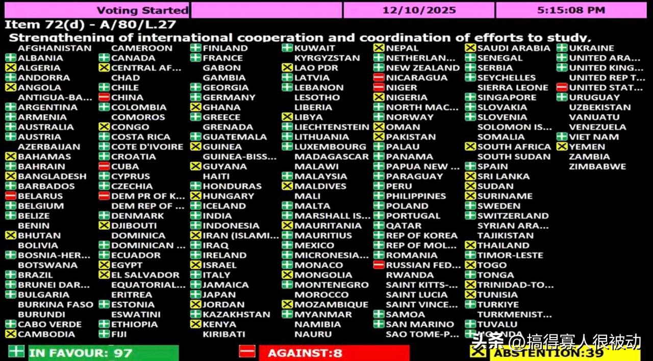 联合国大会以97赞同、8票反对,39票弃权的结果,通过了由乌克兰及部分国家发起的决议草案,旨在加强国际合作并减轻切尔诺贝利灾难的后果。其中,美俄古白朝等国投了反对票。