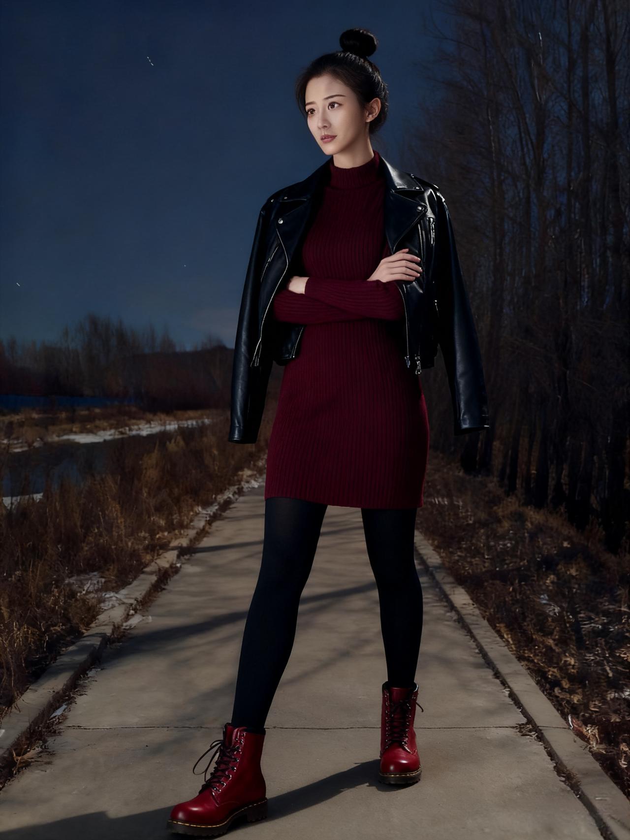 黑是夜的铠甲 皮衣把风都挡在外面 只留酒红裙,像簇暗火 舔着脚踝的凉 红靴是烧红的炭 踩在路面,烫得影 都蜷起来——她站着 像把冷都点着了 连枯草都跟着 暖得发亮