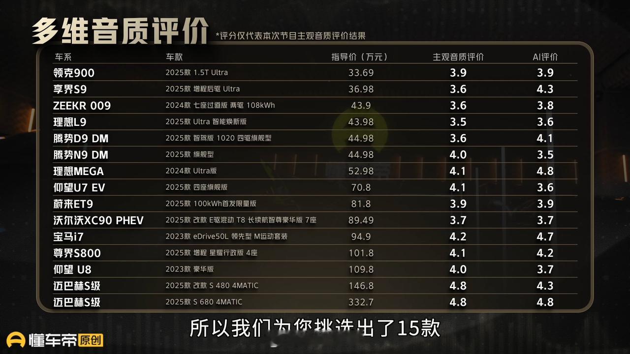 听声音就能判断一辆车值不值 这两年国产汽车越做越卷,大家选车也不再只看三大件,座舱里的“舒服度”反而成了隐形刚需,但说实话,我之前选车时,对音响好不好、隔音够不够静,多半也是凭感觉瞎猜。直到最近才发现自己之前踩了好多认知坑!前两天看了一档50辆车的音响和静谧性试验,其中数据和一些解读都特别有意思,很多结果都和我们平常的认知有出入。我觉得这个还挺好玩的,特别是很多大百万的车,居然还不如国产几十万的车。其中最让我有共鸣的是,那些宣传堆了三四十个扬声器的车,说自己有多少多少声道,其实只是自己宣传的自嗨,测试结果反而不如那种布局合理的。厂家在A柱上两个精心摆放的,比一堆放在各种位置凑数的效果强太多了。之前其实在聊天中有关注过这方面的讨论,很多人觉得加钱选装的高级音响是“智商税”又不敢确定,经过这次专业团队的评测和专业设备测试,也算有了个结论。相信这下不管是正在纠结选车,还是犹豫要不要为音响额外花钱得,都对国产汽车的舒适体验认知有所刷新~汽车音响音质好坏怎么看