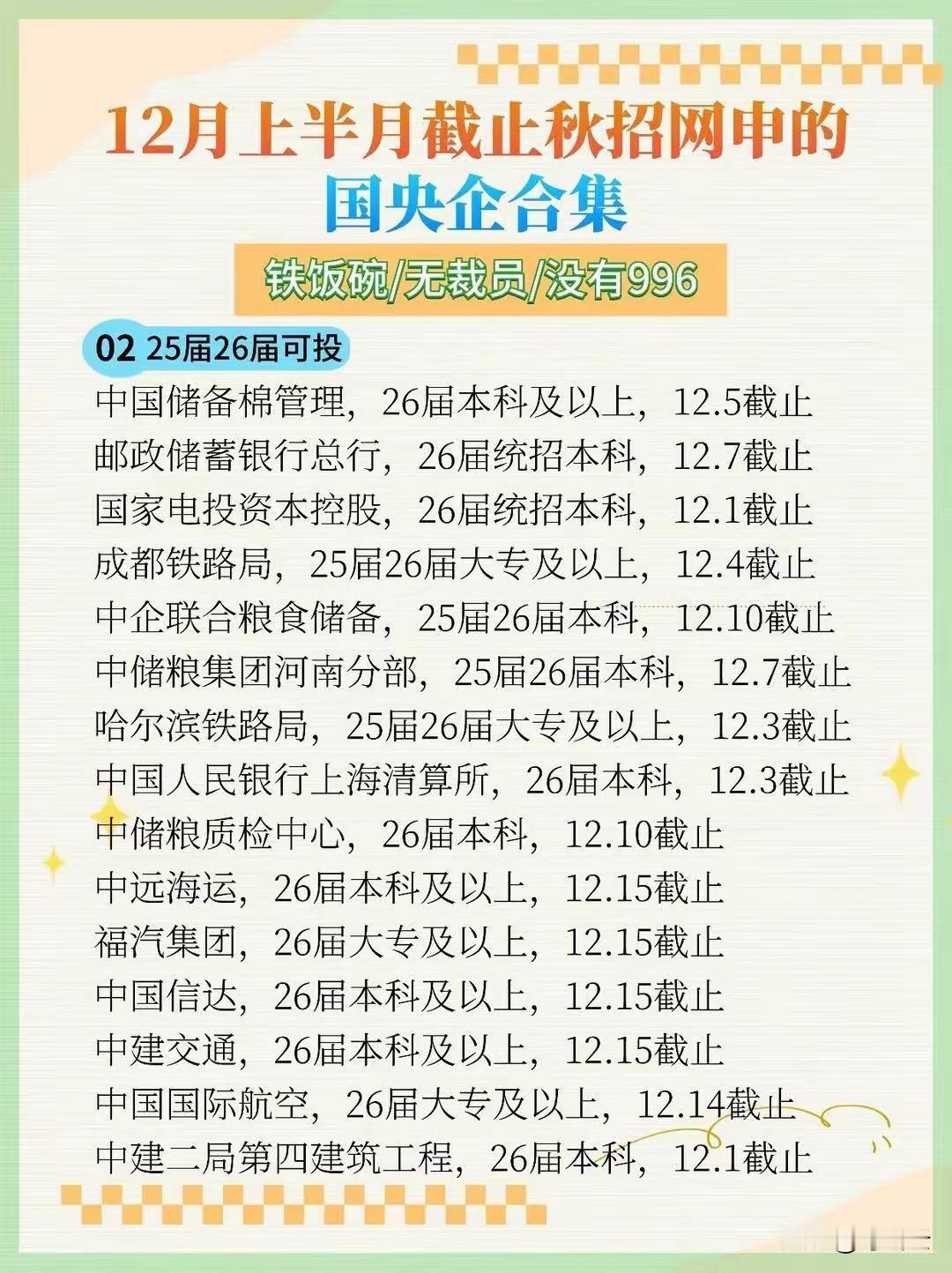 超多好岗!30家国央企正在招聘推荐汇总合集!12月上半月截止网申!有的已经截止了,抓紧时间冲刺上岸!首都机场、中远海运、中国信达、中建交通等还在报名窗口。速速围观揭秘详细内容!欢迎关注@叮咚云 将优先为粉丝职业规划指导,1对1咨询是付费服务,为你定制最适合的就业择业方案!欢迎留言交流讨论。[来看我][来看我] 免责声明:图片来自网络,仅供参考! 国企招聘 央国企招聘