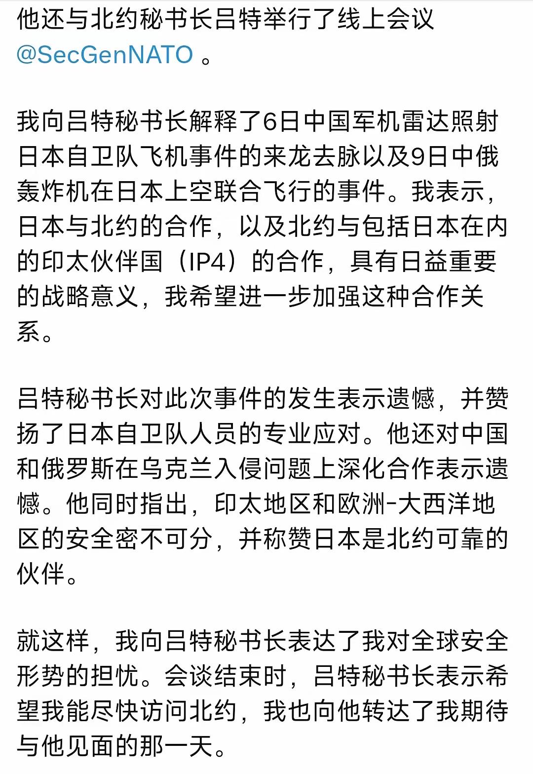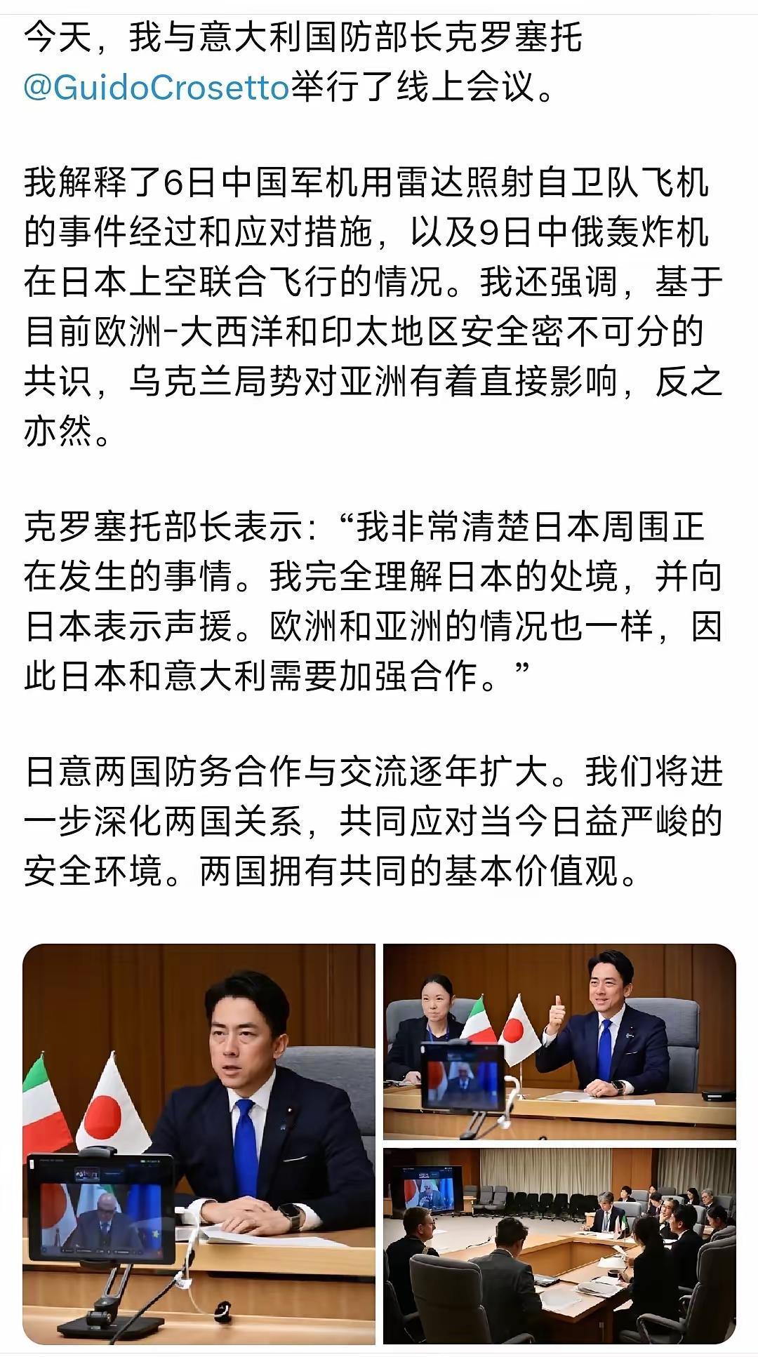 这个日本防卫大臣绝非善类。这次,日本军机骚扰我们军演在先,然后遭到我雷达锁定,出现了这么一个危险情况。 之后,这个日本防卫大臣小泉进次郎跟发了疯一样,四处告状,甚至和当年的老搭档德国、意大利先后通话,似乎要重启轴心国同盟,充分暴露他的军国主义危险倾向。 首先,事件发生后,小泉先是在凌晨2点召开记者会,当记者接到通知,还以为爆发战争了,小泉这是唯恐天下不乱。 然后,小泉进次郎会见了德国驻日大使西吉斯蒙德,指着地图,向德国大使介绍此次“雷达照射”事件的情况,以此寻求德国对其立场的支持。 之后,小泉又打电话给意大利国防部长,告中国的状。双方进行了时长30分钟的沟通,小泉进次郎重点介绍了此次“雷达照射”事件,还提出欧洲与印太地区的安全紧密相关,希望和意大利深化合作以维护地区和平稳定。 再之后,小泉进次郎和北约秘书长吕特开展视频连线,通报了所谓“雷达照射”事件,他还强调日本与北约及印太四国的合作具有重要战略意义,意图借助北约造势,塑造有西方国家支持的舆论氛围。 11号,小泉又发文,说明天他要与美国陆军部长进行电话会谈,说要把美日同盟提升到牢不可破的程度。 通过他的这些举动,证明这个小泉和高市一样,都是危险人物。