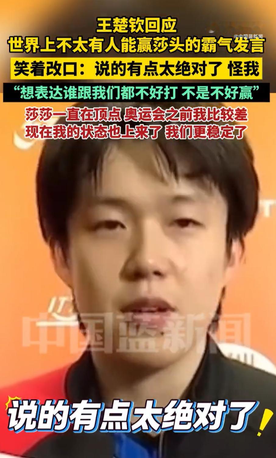 王楚钦笑着回应霸气发言 “世界上不太有人能赢莎头”,我觉得挺好的,好好保持状态