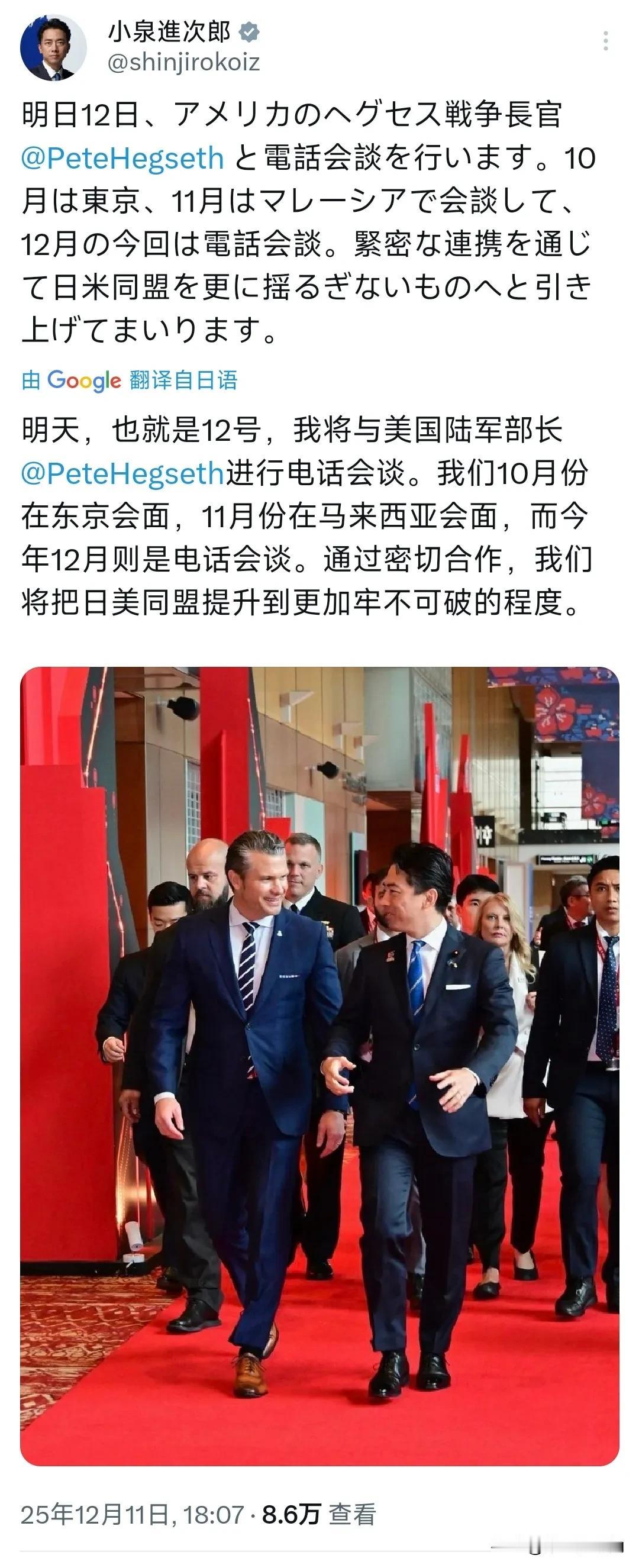 日本防卫大臣小泉进次郎今晚(12月11日晚)发文写道:“明天,也就是12号,我将与美国战争部长赫格塞斯进行电话会谈。我们10月份在东京会面,11月份在马来西亚会面,而今年12月则是电话会谈。通过密切合作,我们将把日美同盟提升到更加牢不可破的程度。” 评几句 小泉进次郎把电话会谈提前“剧透”,还要把“牢不可破”喊得震天响,本质上是给国内看戏:岸田内阁支持率跌破冰点,不抱紧“日美同盟”这条粗腿,明天就得下台。 可现实是,美方把雷达锁定事件不当一回事,一句“继续沟通”就把东京打发了;海上自卫队前脚刚喊“中国军舰火控照射”,美军后脚就把航母撤到第二岛链——这哪是同盟,分明是“声控炮灰”:美国按喇叭,日本往前冲。 小泉如果真敢在电话里“抱怨”,大概率得到的回复仍是标准模板:“We take Japan’s concerns seriously,and we encourage all parties to…(我们重视日本关切,呼吁各方保持克制)”——翻译成人话:继续当雷达反射面,别吵。 所以,这轮通话最大的成果,可能就是小泉推特多两张合影拼图、日媒多几行“深化同盟”的通稿;至于火控雷达、钓鱼岛、台海风险,该谁扛还是谁扛。 一句话:东京把“牢不可破”喊得越响,华盛顿越放心地把锁链再勒紧一圈——毕竟,谁会担心自己的挡箭牌会跑呢?