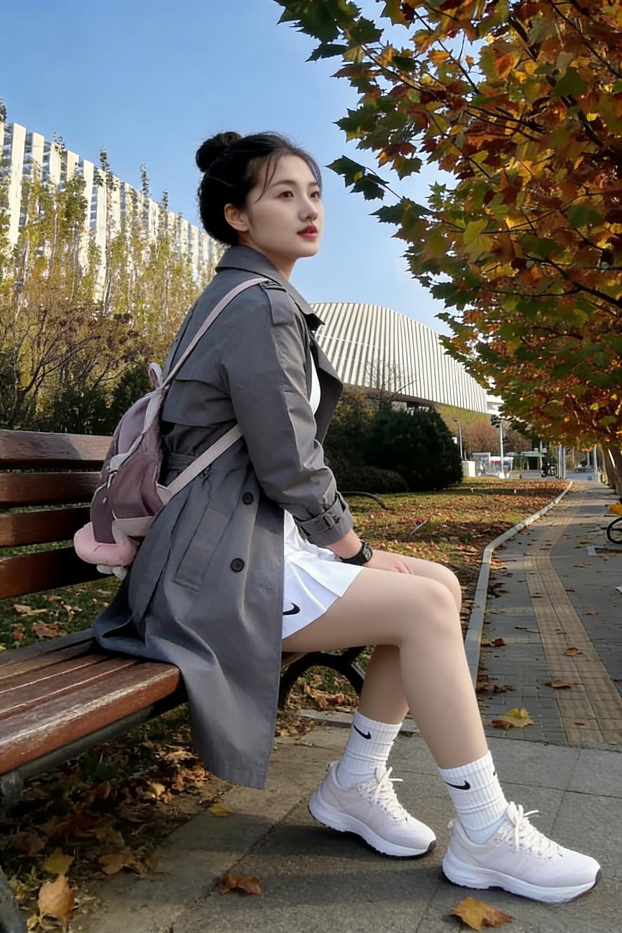 坐在长椅上的时刻 是从奔跑里偷来的停顿 灰风衣是少年的铠甲 裹着未褪去的稚气 ~ 白袜踩着白色球鞋 像踩着云朵的边缘 粉背包里的铅笔盒 还留着课堂的余温 ~ 目光望向远方时 瞳孔里盛着城市的轮廓 梧桐的红,是青春的邮戳 盖在成长的信笺上 ~ 风衣的褶皱里 藏着想要长大的期待 和舍不得走的童年 在秋风里轻轻摇晃