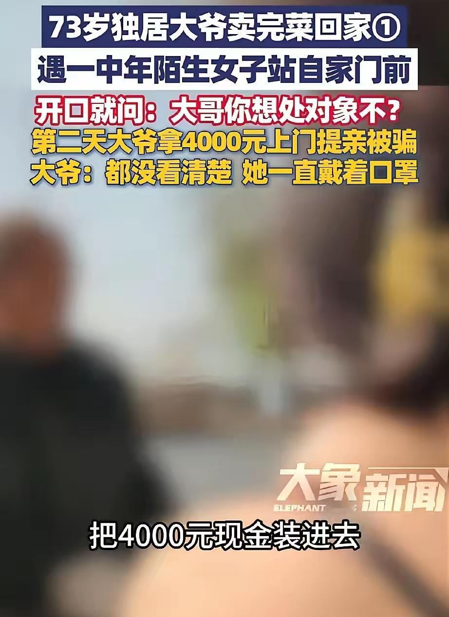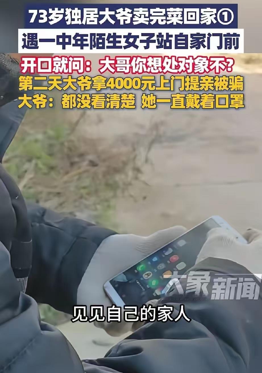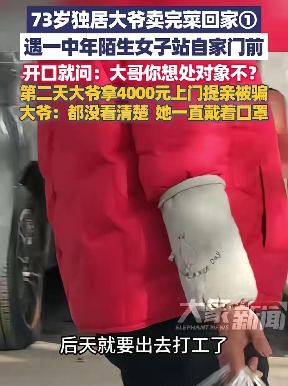 色字头上一把刀,这句话用在这大爷身上真的用对了! 天上掉下来的大馅(陷)饼,被河南濮阳73岁的独居大爷给稳稳的接住了,不是我心坏笑话大爷,73岁的大爷已是走过人生大辈子的人了,就这个骗人的手法都看不透? 这位陌生女子试探性的说跟你处对象,你就还真一口答应了,大爷,你哪来的自信,论年龄人家是中年的女人,你肯定是比她大很多,论生活条件,也是普普通通的! 最搞笑的是,人家戴个口罩,脸都不露出来让你看,上来就说和你处对象,还说让你第二天带着钱去她家提亲,明白人一听,这不太滑稽了嘛! 结果,白高兴一场,人无钱空! 各位读者你们怎么看?欢迎来评论区讨论。
