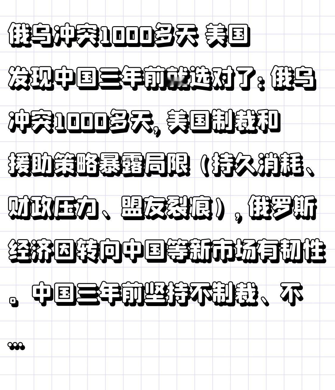 俄乌冲突1000多天 美国发现中国三年前就选对了:俄乌冲突1000多天,美国制裁和援助策略暴露局限(持久消耗、财政压力、盟友裂痕),俄罗斯经济因转向中国等新市场有韧性。中国三年前坚持不制裁、不供武器,外交呼吁克制、提和平倡议,路径更具前瞻性。