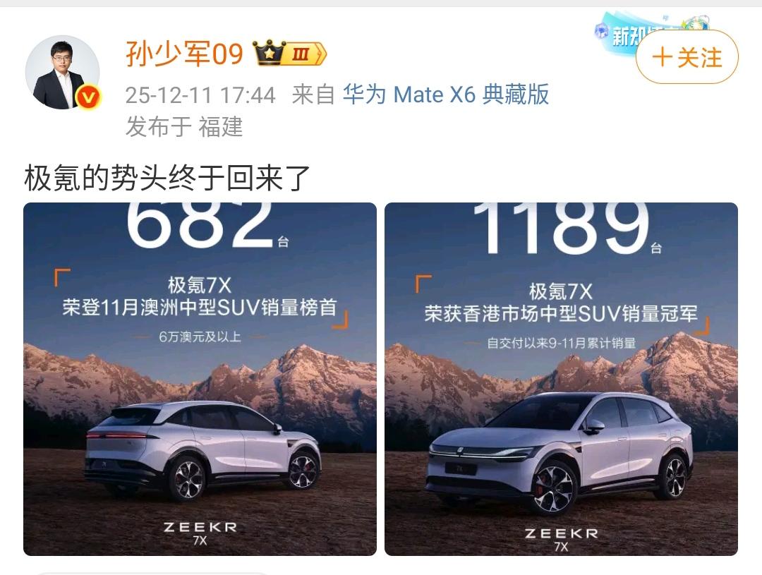 孙少军:极氪的势头终于回来了 ! 极氪7X分别荣获澳洲和中国香港11月份中型suv销量榜首,未来对于各家车企来说,重点都是在除中国大陆以外的市场。 虽然很多市场每个月也就几百台上千辆的水平,但是累积起来也是一个可观的数字。 25025年可以明显的感觉到中国汽车的出口脚步越来越快了,而且出口的并不是很多廉价的车型,有些车型卖的还是比较贵的。