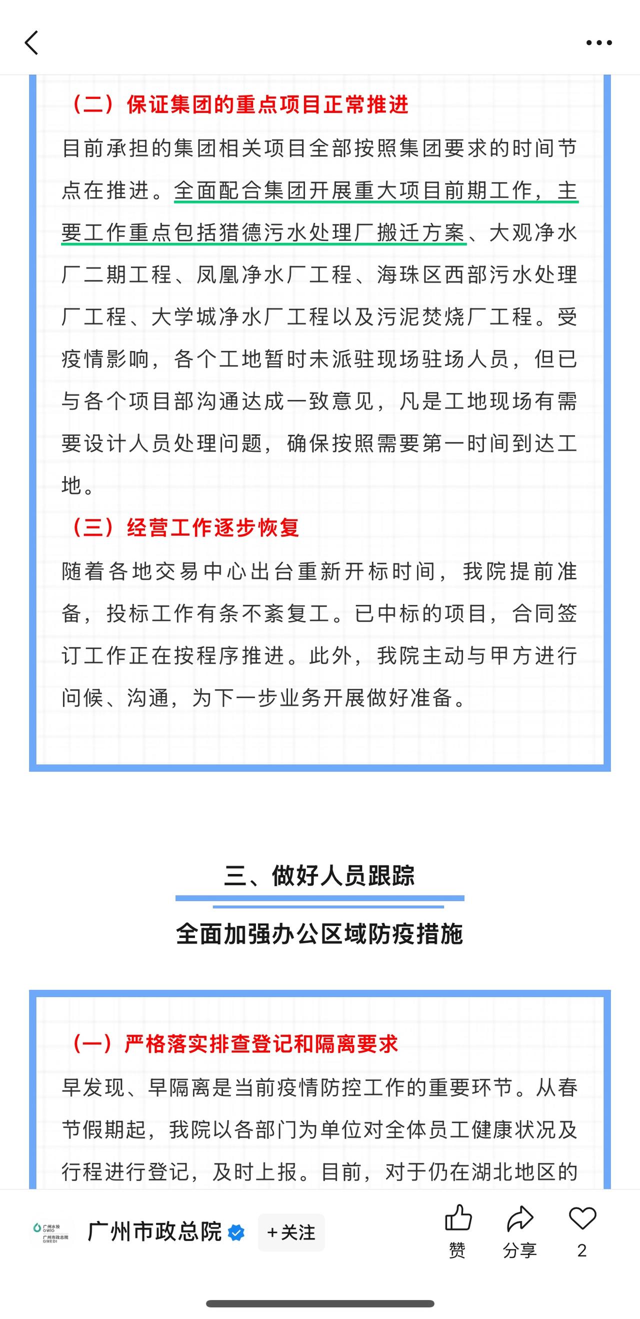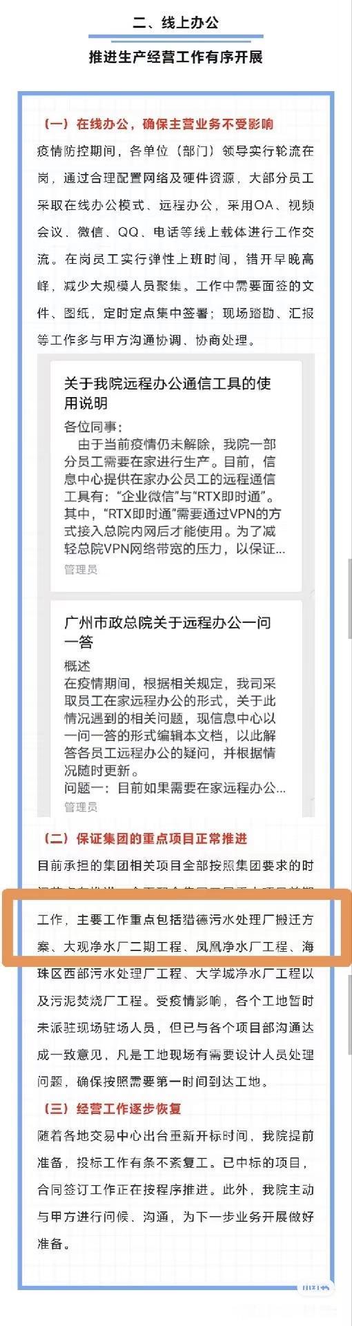 【网友报料】广州市政总院微信公众号上提到过净水厂搬迁。(图一、图二) 火:我查了一下,在2020年2月21日的时候,市政总院在公众号的文章里,确实有提及“全面配合集团开展重大项目前期工作,主要工作重点包括猎德污水处理厂搬迁方案”等内容。(图三) 虽然我暂未找到猎德污水处理厂搬迁方案的后续进展,但这是总院发的文章,如果没有确切的计划,一般都不会随便说的。 当然,到底猎德污水处理厂搬不搬?何时搬?目前没有最新的消息。但结合高质量发展和低效用地再开发的思路来看,我期待广州的核心区域、核心板块有更广阔的发展前景。