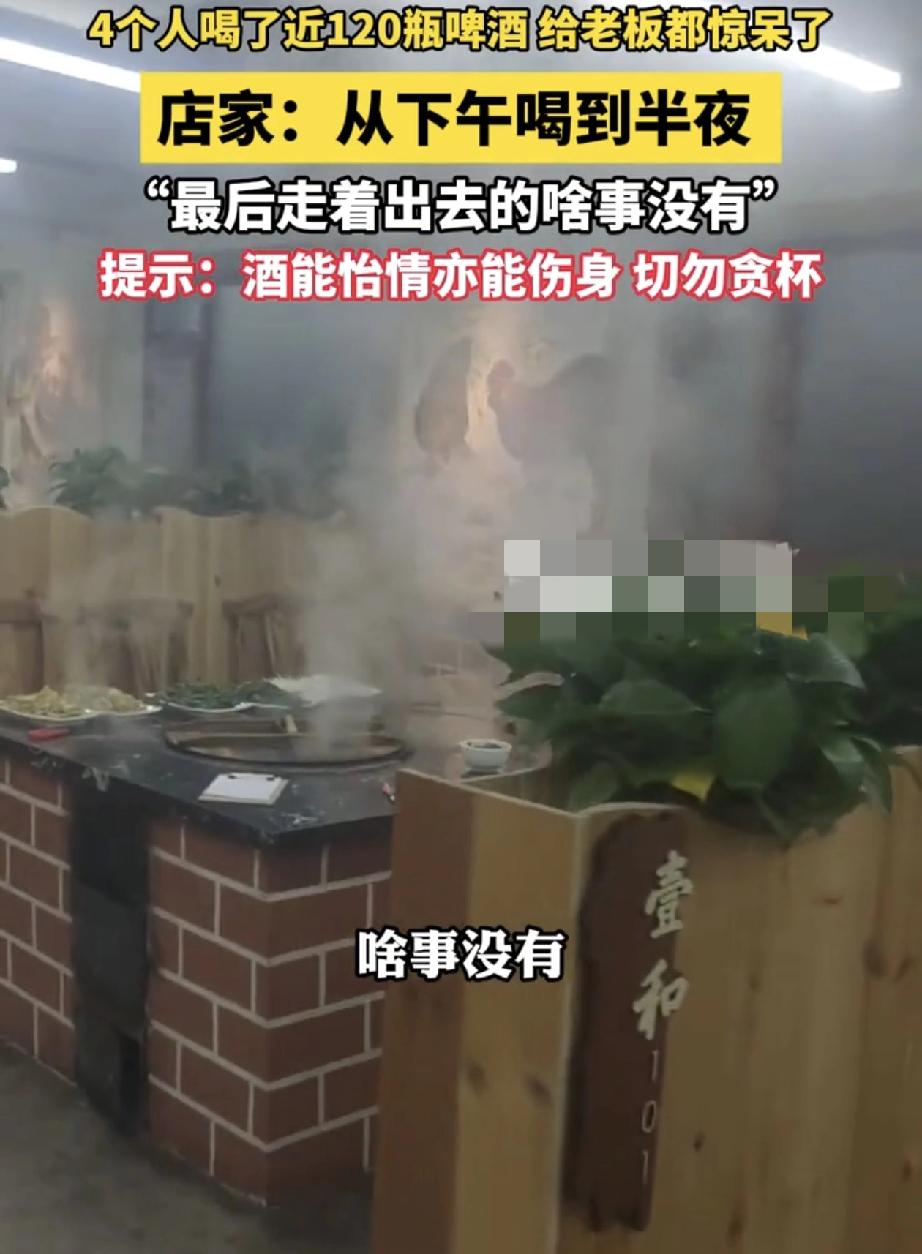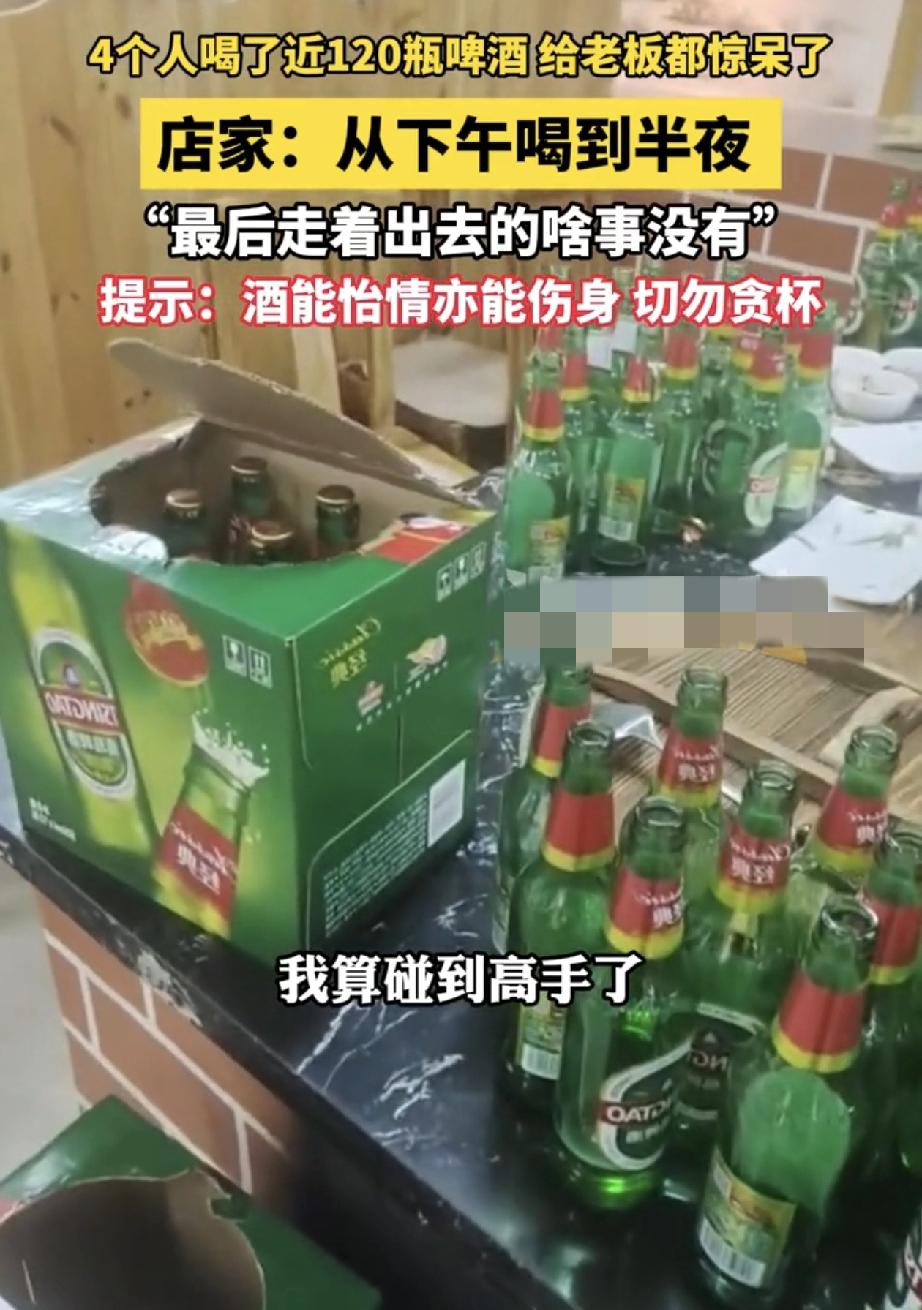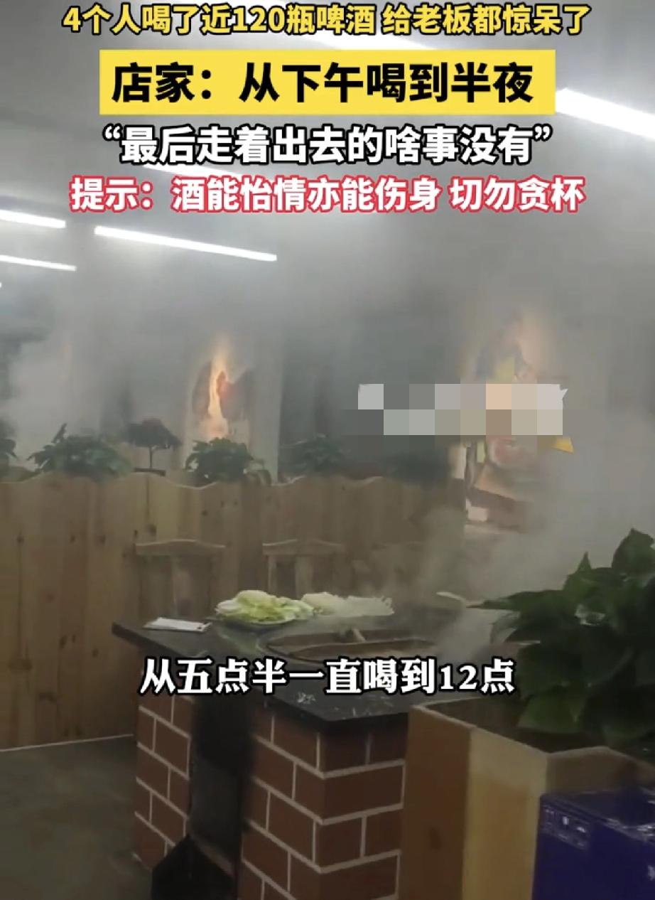 碰到高手了!吉林,一饭店在网上分享,自家饭店来了四个人用餐,不料四人结账时,老板收桌子时发现,他们竟喝了近120瓶啤酒!关键几人最走出店铺时,就像没事人一样。视频可见,这一张饭桌上,菜锅是见底了,这桌上还全是空酒瓶,少说也有个几十瓶,除此之外,桌脚周围也摆满了空酒瓶和空箱子,如果不说是四人喝的,大家可能都以为是一群十来个人喝的了吧。 据老板描述,当天四个人是下午五点半开始用餐的,当时几人就点了一锅鸡,来了十箱啤酒,老板也以为喝不完,结果后来他们又要了两箱,就这样一直吃到了凌晨十二点,虽然东西吃得少,但酒却喝了将近120瓶。 而老板在收拾桌子时,看到他们桌全是空酒瓶,只剩不到一箱的啤酒时,老板也觉得很惊讶,因为这可是四个人喝的呀! 为此老板也佩服表示,这真是碰到高手了,开饭店这么多年,他也是头一回见如此酒量的几人,关键最后几人还是走着出去的,啥事没有! 而此事被分享到网上后,也是大伙的一片热议。有网友表示:我男友一次能喝4两白酒,在我们这横扫千军,这要是有几人的海量,那可不得“称霸武林”了! 还有网友表示:我最多喝过22瓶,喝完都醒酒了,其实啤酒喝到一定程度,就可以一直喝了,就是一直上厕所,俗话说的“喝通了”。[大笑] 更有网友表示:一人平均30瓶,喝了七个半小时,不算多。我朋友两个,中午十一点半到下午四点半,一盘花生米,317瓶一斤装的,平时喝白酒52度七斤没问题,就跟没事人一样,有机会可以切磋一下。 人均30瓶,大约18L,相当于每人干了一大桶矿泉水的量,对于我们这种不会喝酒的人确实是海量。但话说回来,能喝归能喝,还是提醒大家饮酒得适度,这身体健康比啥都重要! 对此大家怎么看?