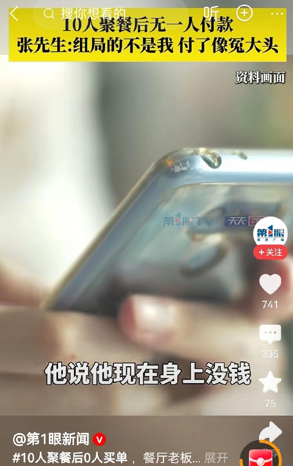 酒肉朋友具象化了。一顿饭就干翻了十个人的友谊!网友说,凑齐这一桌人也是难得。 酒肉朋友,可以一起吃、可以一起喝,就是不能一起扛事。原来段子来源于生活,是如此的真实。搞笑的是,最后警察叔叔让押了身份证的最后一人,一觉醒来居然也“不认账”了。 每个人都把精明写在脑门上,谁都不想当“冤大头”,这以后,看谁还敢称兄道弟去聚餐? 不过,好奇十人聚餐十人都怀了花心思?总能有一个逞能结账的吧?鄙人怀疑塑料情外,可能是真的都没钱结账。如是没钱,就别出去摆阔绰了,安安分分在家吃,不丢人!