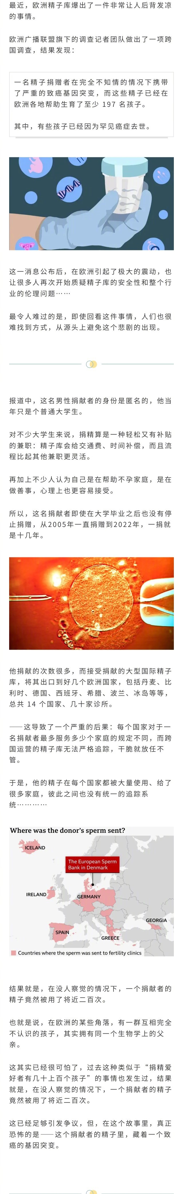 欧洲一名精子捐赠者在完全不知情的情况下携带了严重的致癌基因突变,而这些精子已经在欧洲各地帮助生育了至少 197 名孩子。其中,有些孩子已经因为罕见癌症去世……#男子携致癌基因捐精17年#