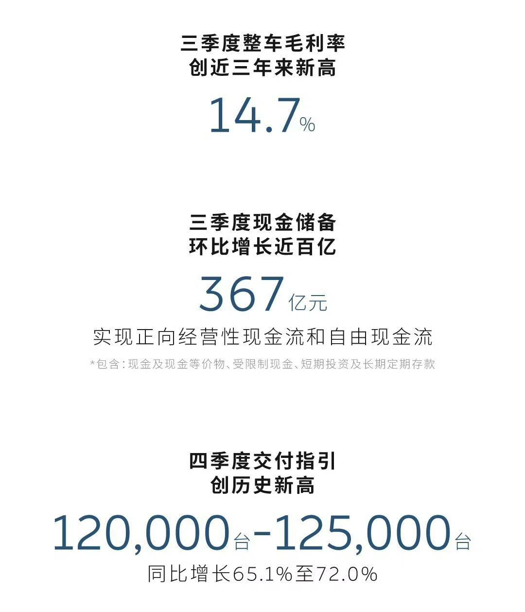 蔚来11月份的销量可以呀,今年最后一个季度还真的有可能盈利! 从目前已经披露的数据来看表现还可以,虽然销量相比较10月份的4万辆有所下滑,但是依旧达到了3.6万辆。 最重要的是在多项指标方面表现得非常强劲,特别是车型好卖带来了大量的现金流。同时,蔚来大规模建设的换电站、充电站设施现在已经可以盈利的。 12月份要是能延续前两个月的销量,那么今年第四季度盈利是非常有希望的。各位是怎么看的?欢迎评论区留言。