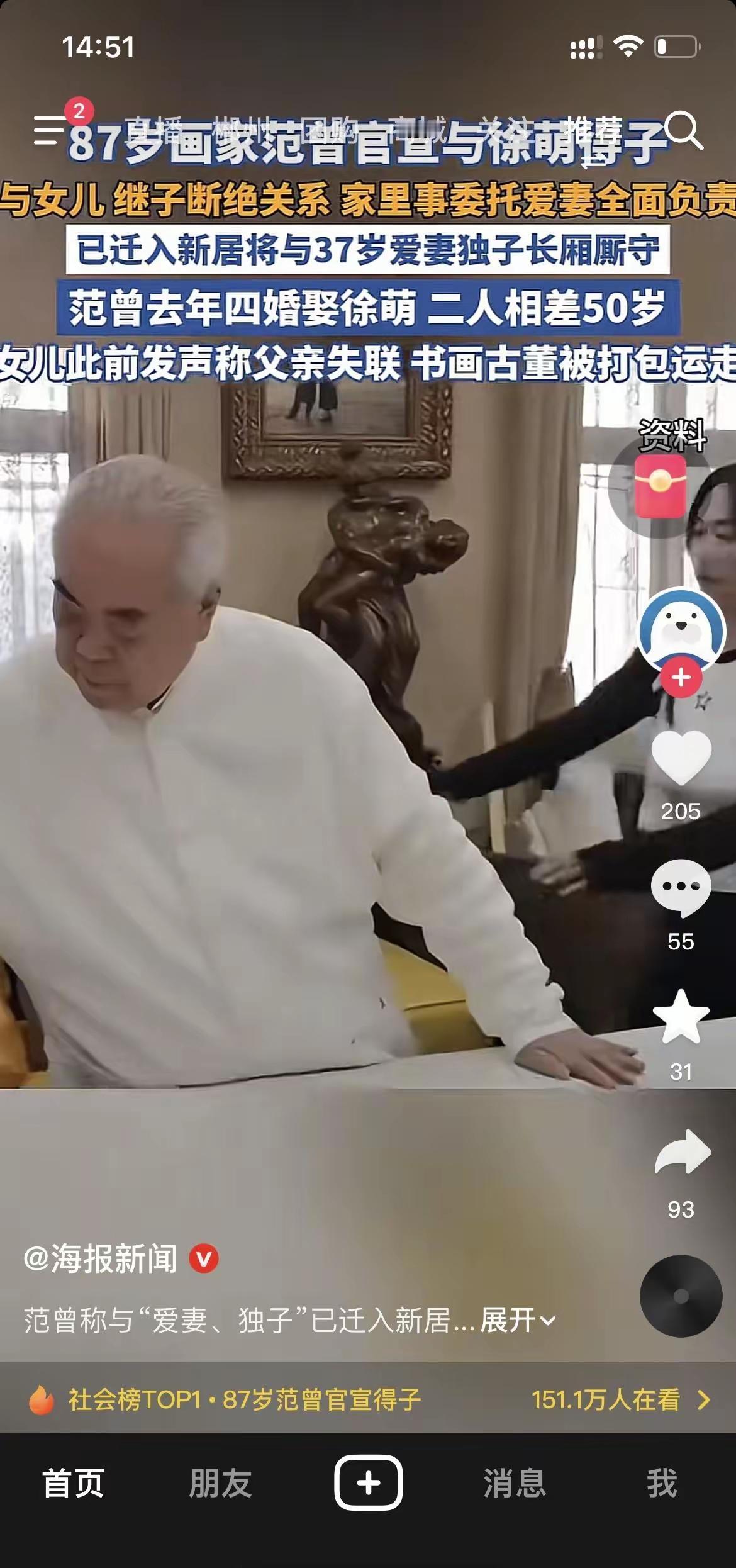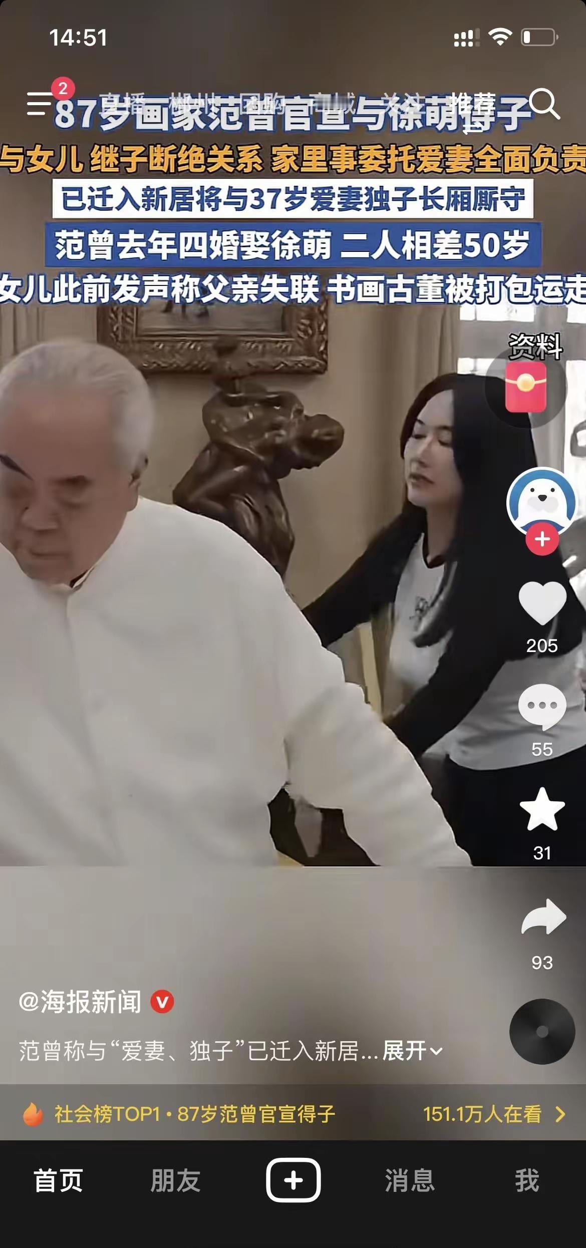 有钱就是好,看范增就知道了,别人87岁住养老院,他娶37岁的娇妻,生儿子。 打破历史记录,范增87岁自然受孕生了一个儿子。 范增不愧是一个老艺术家,他生孩子像他画画一样手到擒来。 为了保障儿子的继承权,什么女儿和继子都断绝关系了。