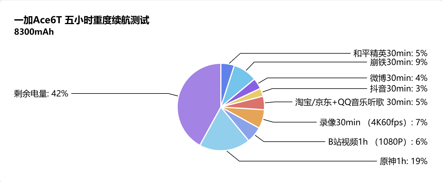 一加Ace 6T还是太懂电竞玩家了!除了《和平精英》支持165Hz高刷这种基操,其他游戏也有明显提升,在《崩铁》压力最大的场景“时政区+黄金时刻”进行了半小时测试,平均帧率依然稳定在59.6帧。最后还替兄弟们实测过了,重度使用五小时后,剩42%接近一半的电量,8300mAh电池带着出远门稳得很。