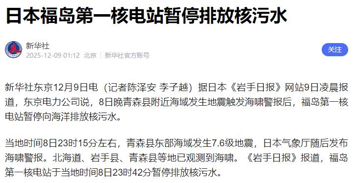 还是地震管用!全世界人民反对日本排放核废水,人家压根都不鸟你,可地震一来,人家主动就停了,这世界上什么才是真理? 各国抗议、民众游行、专家打脸,甚至联合国专家都发声说危害人权,日本政府眼皮都不抬一下,还反过来倒打一耙。 而12月8号深夜,日本青森县地区发生了一场7.5级地震,东京电力公司立马就停了福岛的核污染水排海作业,给出的理由是要确保安全,这反转来得比翻书还快! 事实上,从2023年8月日本第一次排海开始,全世界的反对的声音就没断过。韩国民众举着“大海不是日本的核垃圾场”的牌子,在日本大使馆前抗议,上千人聚在一起喊口号,最大在野党还说这是“核污染水恐怖袭击”。 菲律宾、斐济这些太平洋岛国更着急,他们靠海吃饭,专家说核污染水里的碳14几千年都有危险,可能害了几代人。俄罗斯、德国的媒体和环保组织都骂这是“犯罪行为”,我国外交部也明确说日本是把私利凌驾于全人类福祉之上。 可日本压根没当回事。截至这次地震前,他们已经排了16次,累计超过12.5万吨核污染水了。而他们之所以敢这么硬气,说白了就是经济责任他们并不想担。 日本专家组早就列过五种处理方案,排海是最便宜的,比固化填埋、蒸汽排放省太多钱。而且储水罐早就锈迹斑斑,换罐子要花钱,维护更费钱,他们不想承担这个成本。 更关键的是,日本还想要重启核电站,要是把核污染水处理得太认真,反而会制约核电发展,这才是他们的真实心思。因此国际社会的谴责再激烈,那也没碰着日本的真利益,所以不管用,可地震却直接戳中了他们的软肋。 福岛核电站本来就是事故遗址,震一下说不定就出更大的问题。东电自己也怕,地震后赶紧让工人撤离海岸现场,先停了排海再说,就是怕地震把核设施震坏了,搞出比排海更大的灾难,到时候花钱更多,责任也更大。 不过这停排倒也没坚持多久,等确认设施没异常,十多个小时后他们就又重启了。 这就下更清楚了:日本不是不能停,是不想为别人停,只肯为自己的安全停。