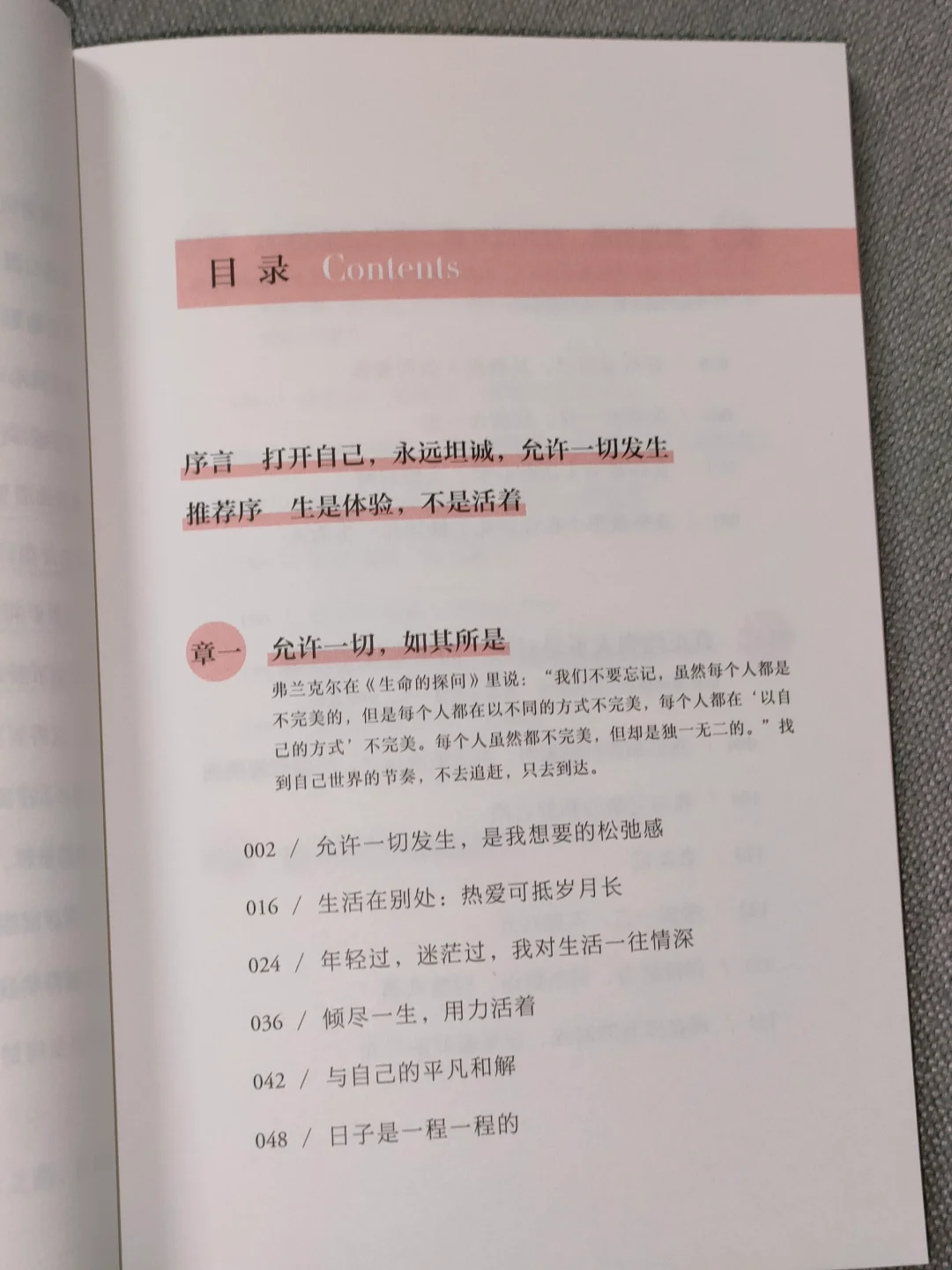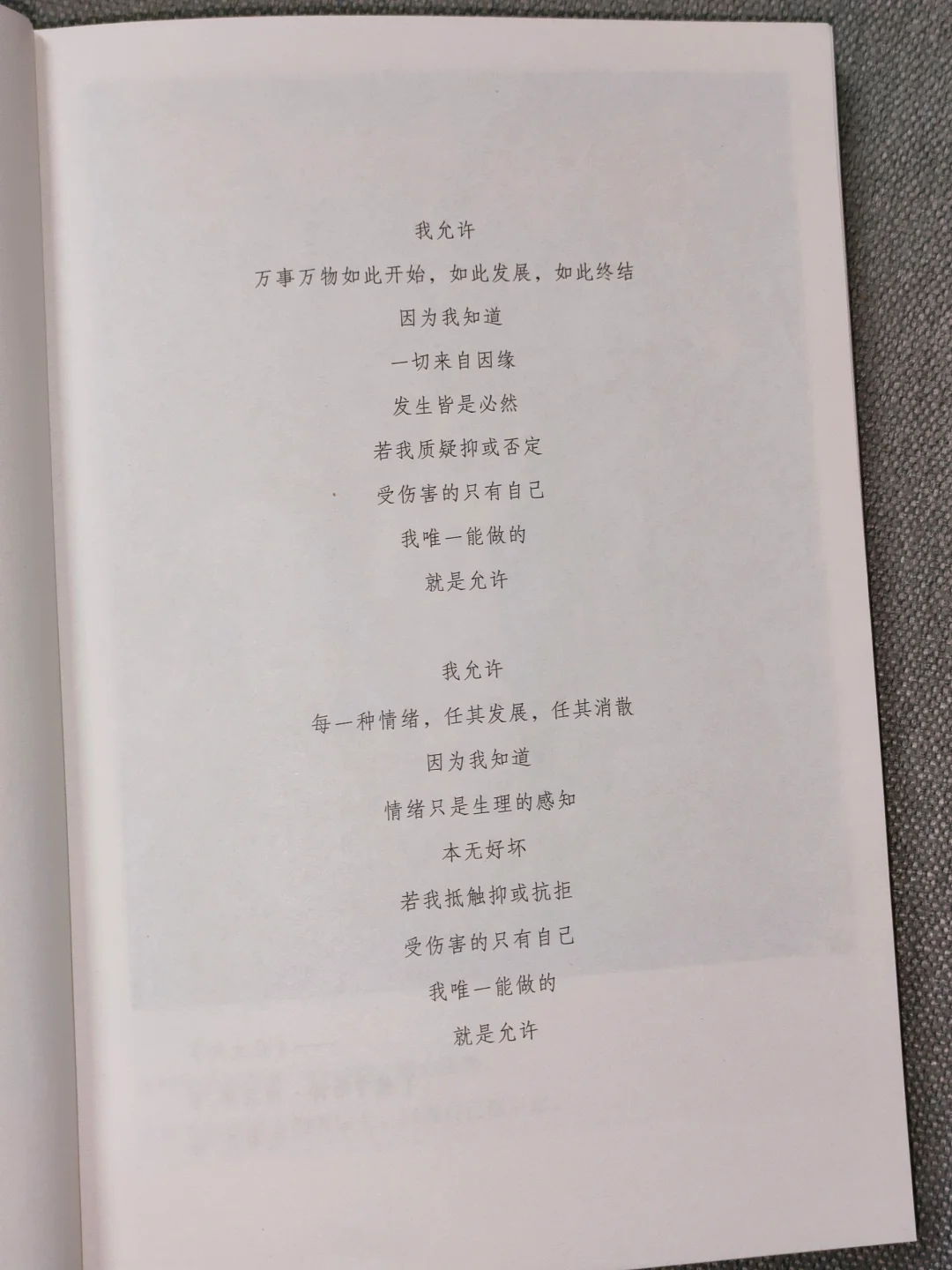 允许遗憾、愚蠢、丑恶、虚伪;允许付出没有回报;允许自己偶尔的失控、崩溃、脆弱;允许给自己一些时间调整、放空、松弛;允许一切,如其所是……睡前,放过自己。