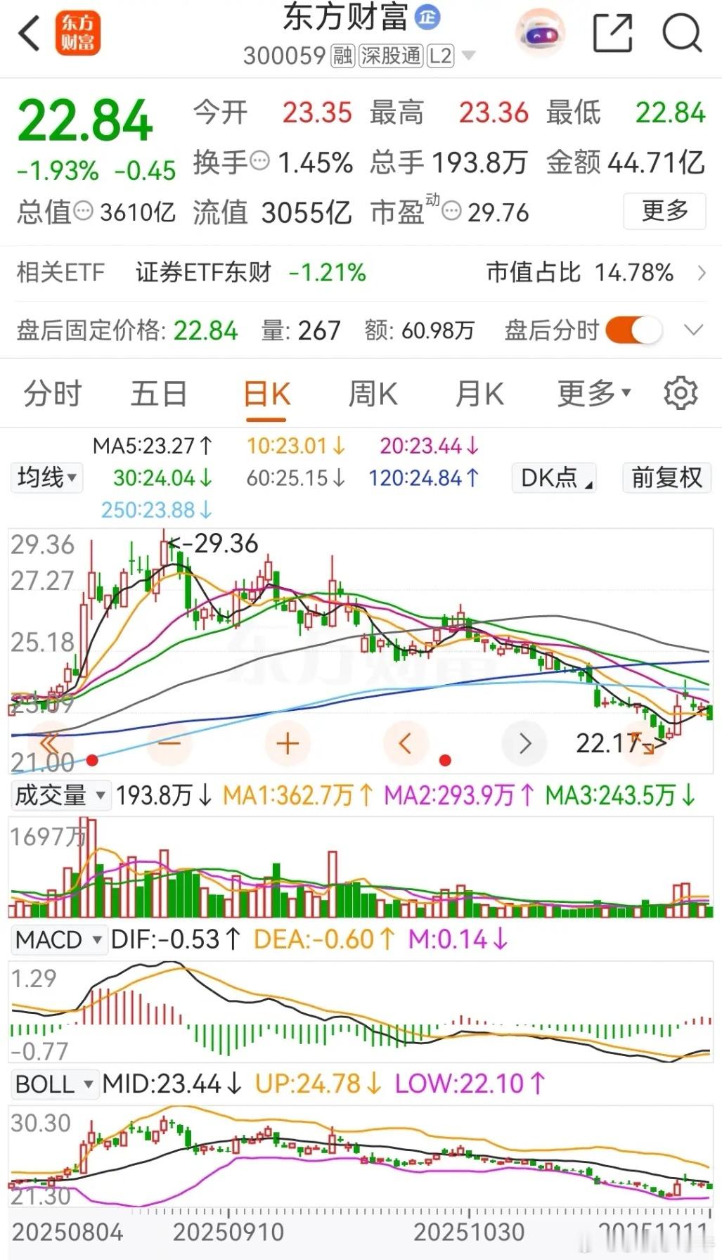东方财富和中信证券高开低走,双双下跌,只是在尾盘时,中信证券是小幅勾起,而东财则是以最低价报收,在资金流向上,今天二者都是被主力资金净卖出。东方财富今天早盘高开后就直接进入了阴跌模式,一直跌到收盘,下跌的跌幅为1.93%,收盘报价为22.84元,全天的成交金额为 44.71 亿元,属于缩量调整。在资金流向上,今天被主力资金大幅净卖出了6.1492亿元,目前已是连续四天被主力资金净卖出了,近五个交易日得合计净卖出金额为9.5122亿。从走势上看,今天收出的这根阴线,直接击穿了五、十和二十日均线,再次回到了之前的破位态势之中。中信证券今天同样也是高开低走,开盘后直接进入下跌模式,直到了尾盘时才有所勾起。今天的跌幅为 0.81%,收盘报价为28.29元,成交金额约为21.03亿元,属于缩量调整,且是连续三天缩量了。在资金流向上,主力资金今天净卖出了1.6149亿元,目前已是连续三天被主力资金净卖出,而近五个交易日则是合计被净买入了8.3868亿元。从走势上看,中信证券今天的低点和昨日几乎一样,依然没有完全封闭本周一的跳空上涨缺口,整体走势还是要比东财强势不少。对于二者的后续走势,从投资逻辑上来看,中信证券的股息率为2.6%(分红率32%),吸引稳健资金;而东方财富的股息率仅为0.7%,利润留被存用于技术投入。此外,当前券商板块的PB 1.52倍(历史40%分位),但ROE预期达70%分位,存在估值修复空间。