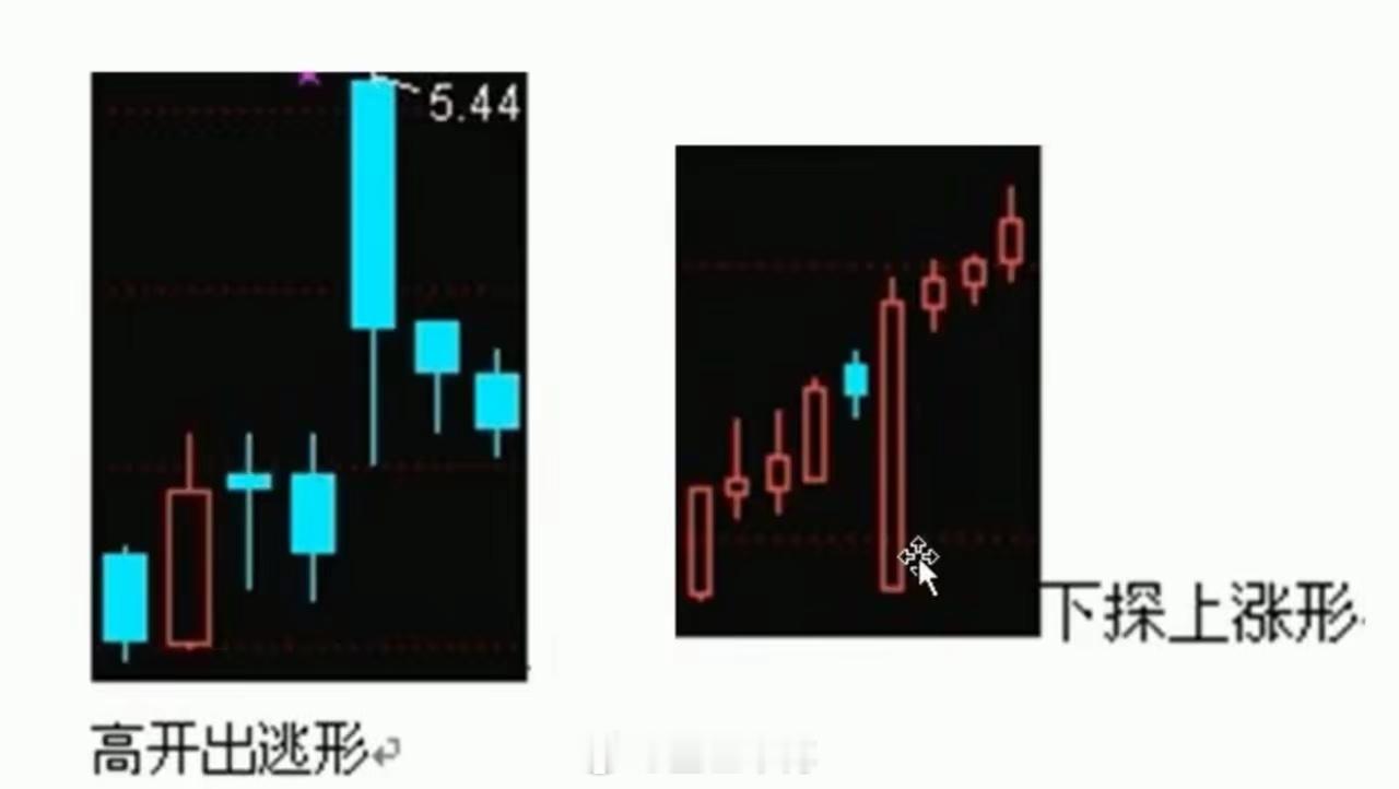 K线形态干货:高开出逃形和下探上涨形高开出逃形:1. 特征:在跌势中股价突然大幅高开(甚至以涨停板开盘),当天就遭到空方一路打压,收出一根大阴线(甚至以跌停板收盘)。2. "高开出逃形"多数是被套庄家利用朦胧消息拉高出货所致,一般在这根大阴线之后,股价将有一段较大跌势。因此投资者见到此 K 线图形,唯一的选择就是马上止损离场。下探上涨形:1. 特征:在上升行情中,股价突然大幅低开(甚至以跌停板开盘)当日以涨势收盘(甚至以涨停板收盘),从而拉出一根低开高收的大阳线。这就构成了先跌后涨的形态,故名之"下探上涨形"。 2. 从技术含义上来说,"下探上涨形"往往预示着后面将有一段较好的上升行情。如果这种 K 线出现在涨势初期,它发出的买进信号就更加可靠。财经